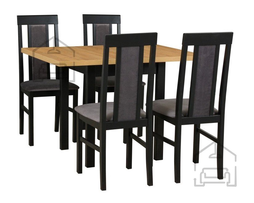 Das Esszimmer-Set Tisch Max 7 mit den passenden Stühlen Nilo 2 des polnischen Herstellers Drewmix bietet eine gelungene Kombination aus Funktionalität, Ästhetik und solider Verarbeitung. Der Tisch mit ausziehbarer Konstruktion aus massivem Buchenholz und einer laminierten Oberfläche in der Farbkombination Schwarz/Grandson lässt sich mühelos an Ihre Bedürfnisse anpassen – sei es für ein gemütliches Familienessen oder gesellige Runden mit Freunden. Die Stühle in elegantem Schwarzton 28B überzeugen durch ihr stabiles Holzgestell, das für festen Halt und Langlebigkeit sorgt. Zusammen entsteht ein harmonisches Ensemble, das natürliche Wärme und moderne Raffinesse in Ihr Zuhause bringt.
