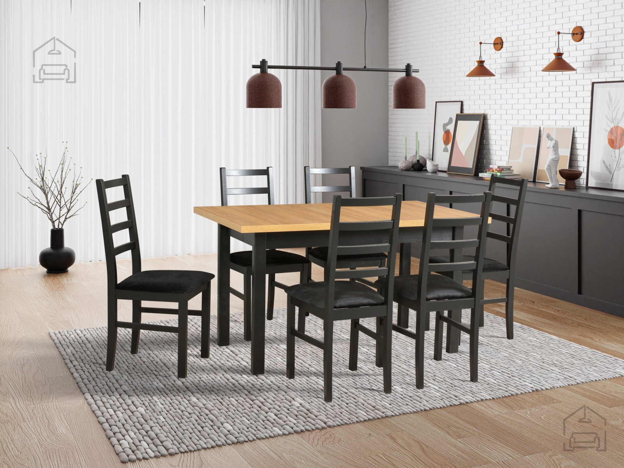 Das Esszimmer-Set Modena 1 XL mit ausziehbarem Tisch und sechs Stühlen Nilo 8 verbindet harmonisch ansprechendes Design mit praktischer Alltagstauglichkeit. Gefertigt aus massivem Buchenholz und einer laminierten Tischplatte überzeugt es durch Stabilität, Langlebigkeit und robuste Verarbeitung. Die Kombination aus Schwarz und dem warmen Holzton Grandson verleiht dem Raum einen modernen, zugleich gemütlichen Charakter. Der Tisch lässt sich von 140 bis 220 cm verlängern und passt sich so mühelos der Gästezahl und jedem Anlass an – vom täglichen Familienessen bis zum festlichen Abend.