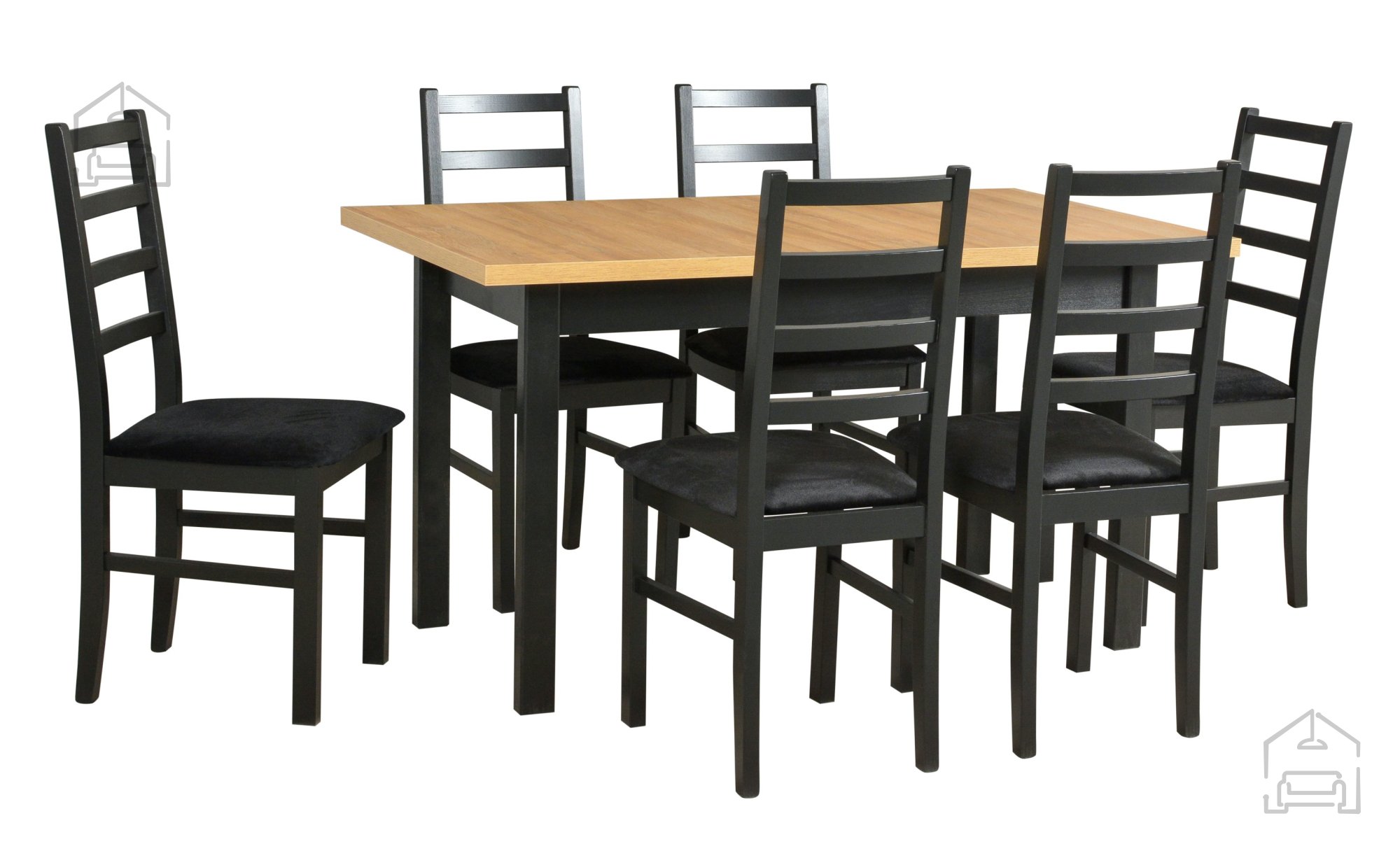 Der polnische Hersteller Drewmix ist bekannt für präzise Holzverarbeitung und detailgenaue Fertigung. Der Tisch Modena 1 XL besitzt einen stabilen Rahmen aus massivem Buchenholz, der auch in ausgezogenem Zustand sicheren Halt bietet. Die laminierte Oberfläche ist kratz- und fleckenresistent und somit besonders pflegeleicht – ein feuchtes Tuch genügt zur Reinigung. Der Stuhl Nilo 8 ergänzt das Ensemble mit seiner ergonomischen Form und der bequemen Sitzfläche, gepolstert mit schwarzem Stoff in der Ausführung 29B. Mit seinen Maßen von 40 × 43 × 94 cm bietet er angenehmen Sitzkomfort, ohne rund um den Tisch zu viel Platz einzunehmen.