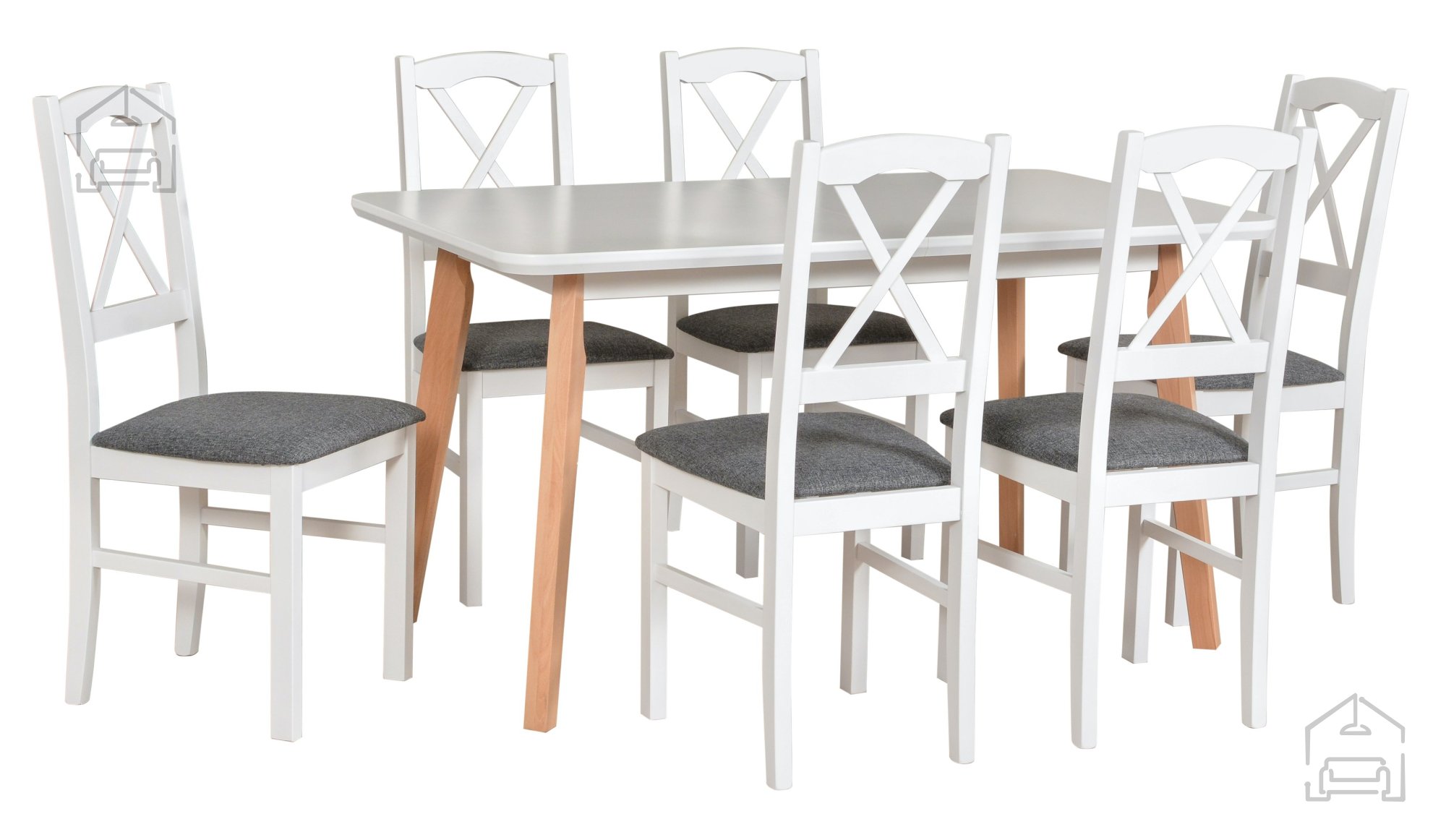 Zum Set gehören auch sechs Stühle des Modells Nilo 11 in der Farbe Weiß 1B hygge 96, die perfekt auf den Tisch Oslo 7 abgestimmt sind. Ihre Gestelle bestehen ebenfalls aus massivem Buchenholz, was für Stabilität sorgt, während die weich gepolsterte Sitzfläche hohen Sitzkomfort auch bei längeren Mahlzeiten bietet. Die Maße der Stühle (40 × 43 × 95 cm) ermöglichen ergonomisches Sitzen, und die Rückenlehne ist so geformt, dass sie die natürliche Körperhaltung unterstützt.