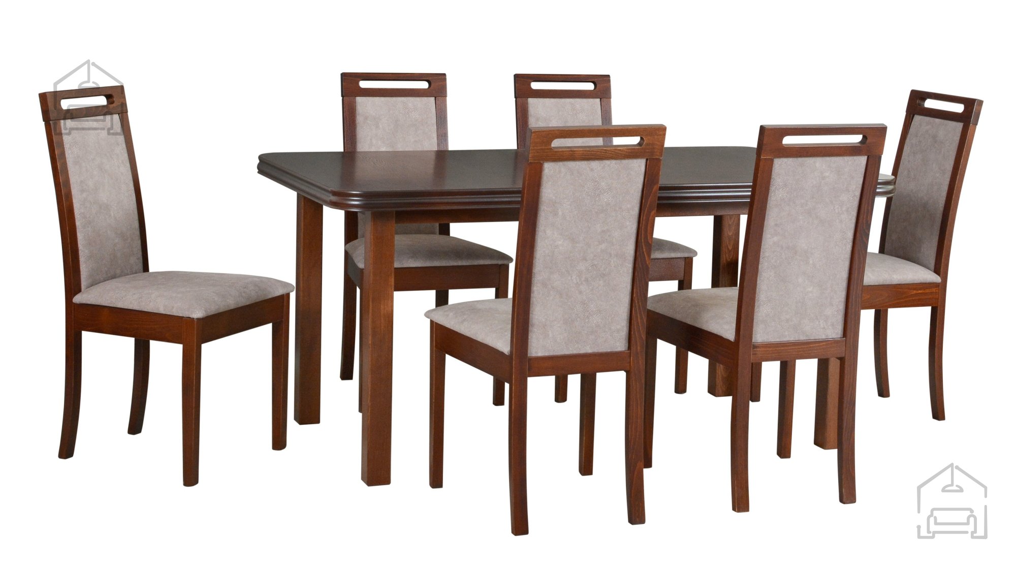 Ausziehbarer Esstisch 160–220 × 90 × 76 cm mit sechs passenden Stühlen: Esszimmer-Set Wenus 5 Nussbaum + 6 Stühle Roma 6 Nussbaum 25B Dora 22 – Drewmix.