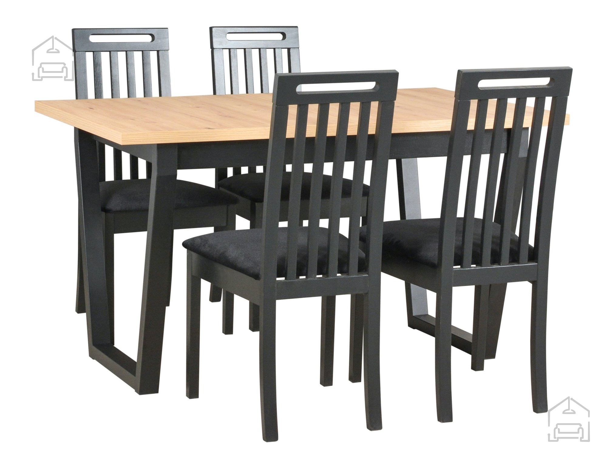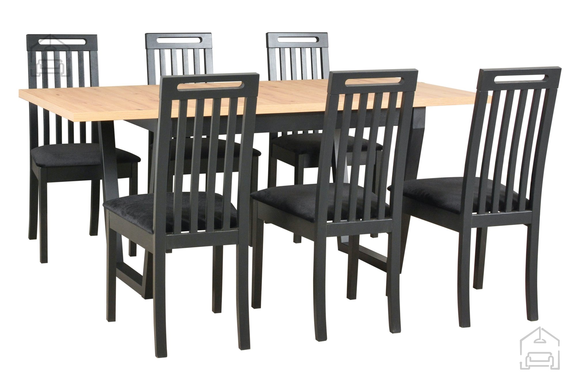 Ausziehbarer Esstisch 140–180 cm aus massiver Buche: Essgruppe Ikon 2 Schwarz/Artisan + 6 Stühle Roma 10 Schwarz 29B – Drewmix.