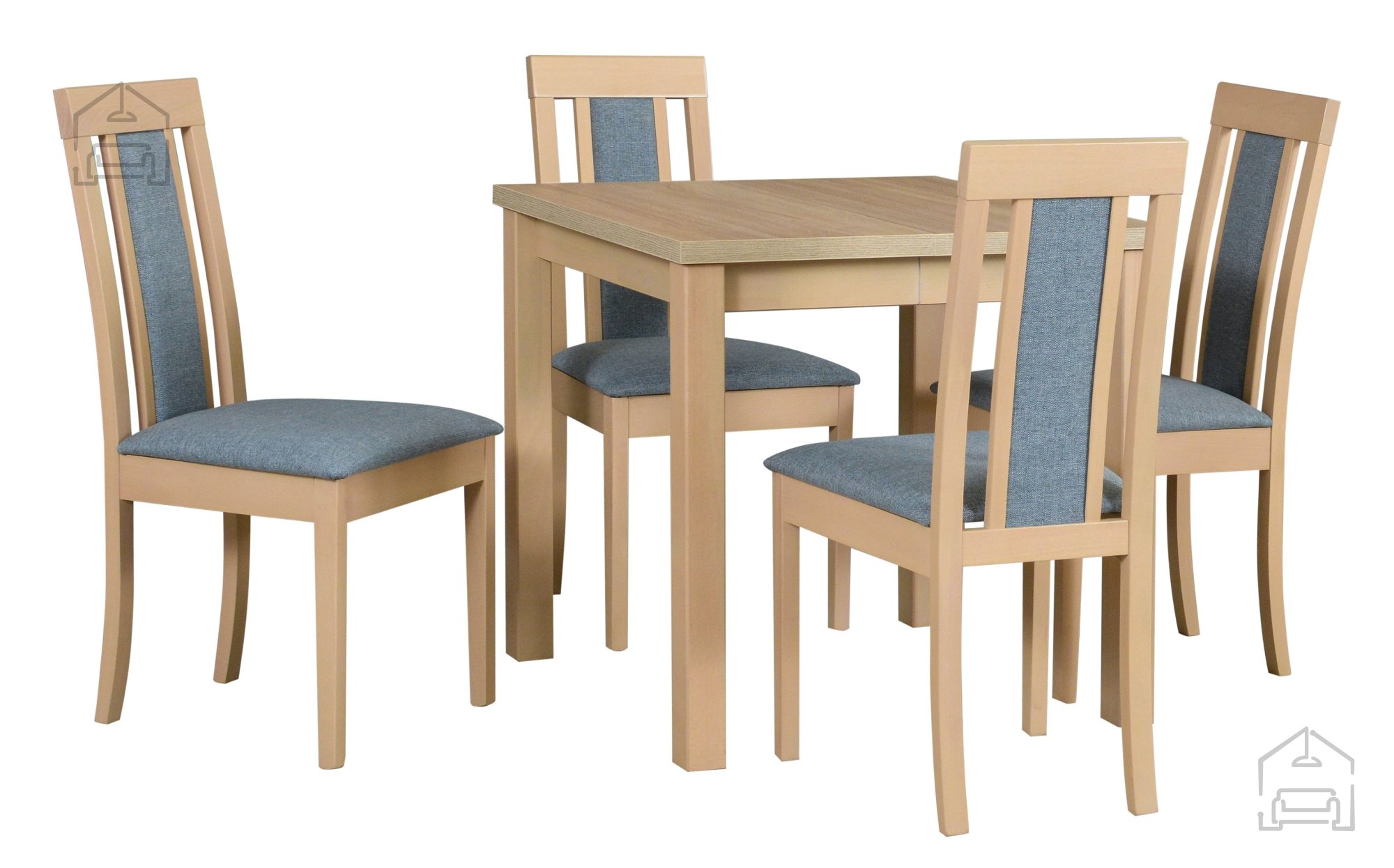 Im Mittelpunkt des Sets steht der stabile, ausziehbare Tisch mit den Maßen 80 × 80–160 × 76 cm. Dank des einfachen Mechanismus lässt sich die Tischplatte rasch und sicher vergrößern, sodass mehrere Personen bequem Platz finden. Die laminierte Oberfläche ist kratz- und fleckenresistent und daher besonders pflegeleicht – ideal für den täglichen Gebrauch. Das Gestell aus massivem Buchenholz sorgt für Stabilität, während die natürliche Holzstruktur Wärme und Gemütlichkeit vermittelt.