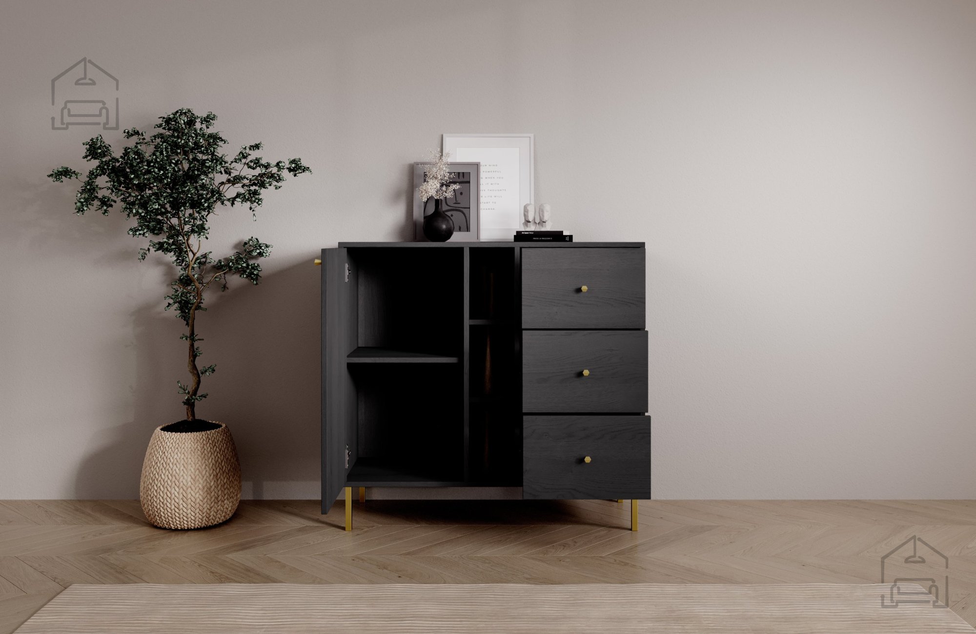 Wenn Sie auf der Suche nach der perfekten Balance zwischen Ästhetik und Funktionalität sind, wird Sie diese moderne Kommode mit ihrer schlichten Eleganz und ihrem zeitlosen Design begeistern. Durch das schwarze Finish und die minimalistische Form fügt sie sich mühelos in verschiedenste Einrichtungsstile ein – von modern-industriell bis hin zu warm und elegant. Ihr edles Erscheinungsbild unterstreicht den Charakter des Raumes und bietet zugleich die Alltagstauglichkeit, die man sich wünscht.
