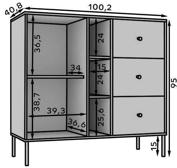 Die Kommode bietet eine ideale Aufteilung des Stauraums: eine Schubladeneinheit mit drei großzügigen Laden sowie drei Schrankfächer, in denen Sie alles Wichtige – von Dokumenten und Kleidung bis zu Dekoartikeln und Heimtextilien – ordentlich verstauen können. Mit diesem Möbelstück bleibt Ihr Zuhause stets gepflegt und zugleich stilvoll ausbalanciert.