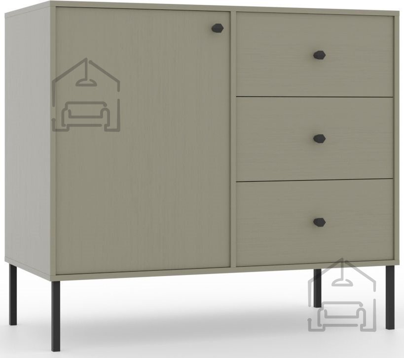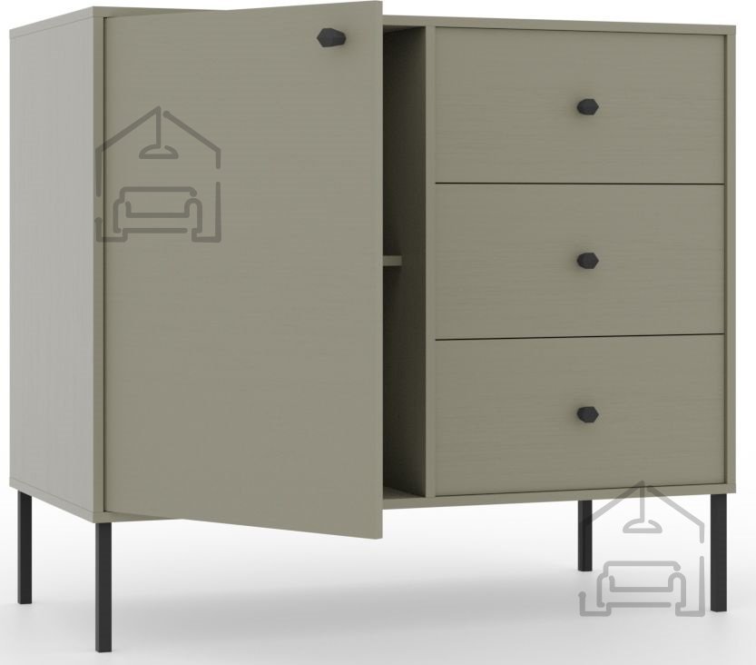Mit den Maßen 83,6x40,8x73,9 cm bietet die Kommode ausreichend Stauraum, ohne zu viel Platz einzunehmen. Drei großzügige Schubladen sorgen für Übersicht und Ordnung bei Kleidung, Dokumenten oder Alltagsgegenständen. Ergänzt wird das Ganze durch ein geräumiges Fach mit Tür, in dem Bücher, Boxen oder Dekoartikel Platz finden. Diese Mischung aus offenem und geschlossenem Stauraum ermöglicht eine perfekte Organisation und einen aufgeräumten Gesamteindruck.