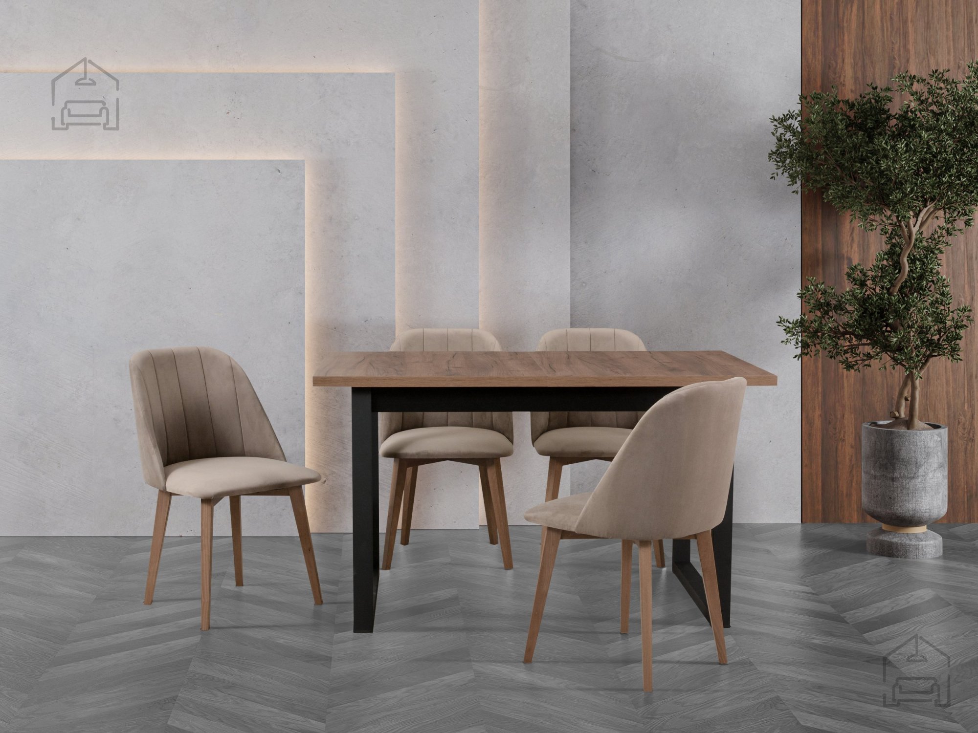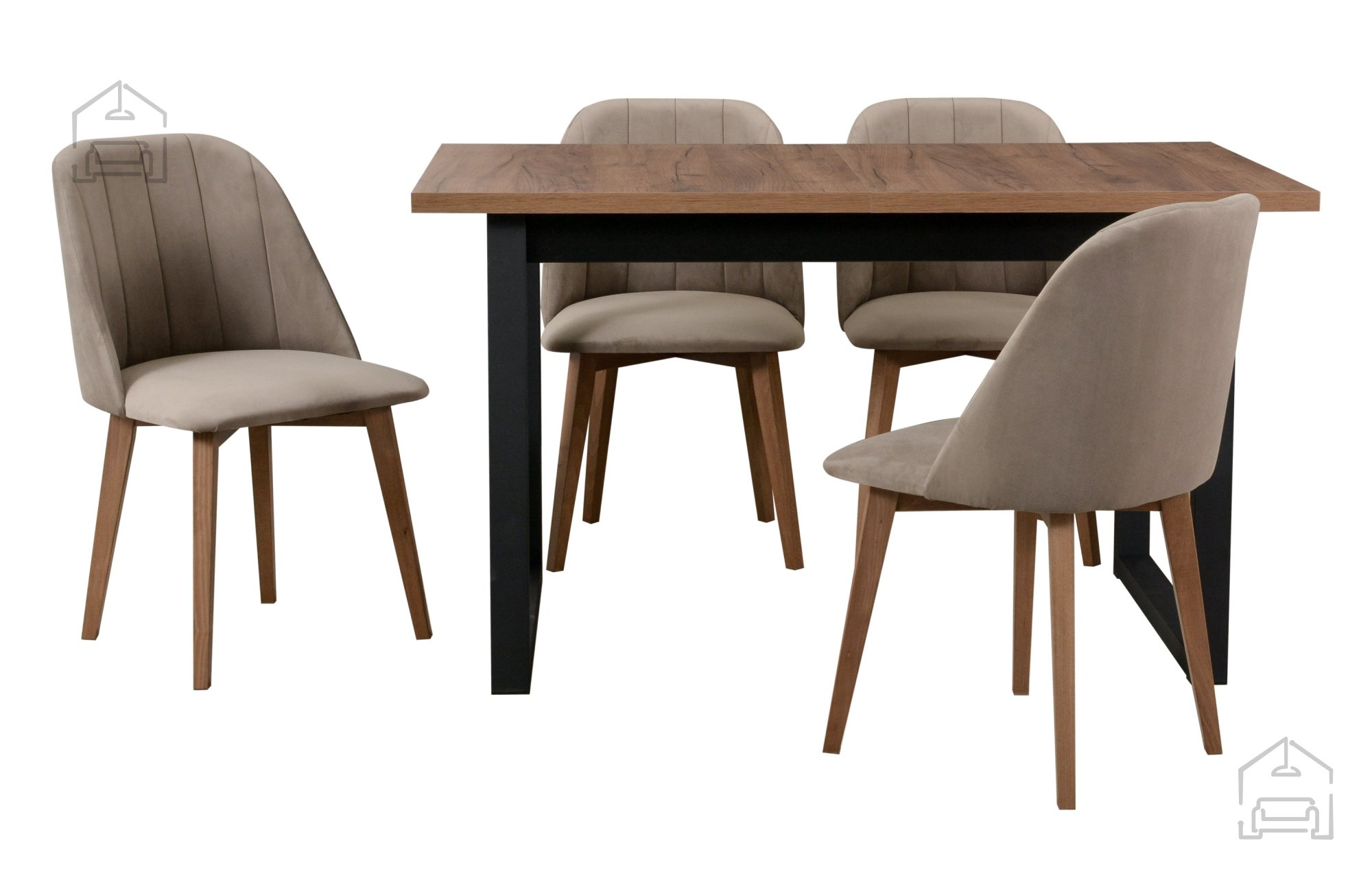 Der Esstisch aus dem Set Ikon 3 ist auf Alltagstauglichkeit ausgelegt. Dank seiner Ausziehfunktion lässt er sich im Nu von einem kompakten Tisch für den Alltag in eine größere Tafel für Familienessen oder festliche Anlässe verwandeln. Der einfache Ausziehmechanismus ermöglicht eine Längenverstellung von 140 auf 180 cm, während die massive Buchenholz-Konstruktion stets für Stabilität sorgt. Die laminierte Platte ist kratz- und feuchtigkeitsresistent, wodurch der Tisch lange schön bleibt. Die Kombination aus schwarzem Untergestell und heller Nussplatte schafft einen modernen Kontrast, der sowohl zu klassischen als auch minimalistischen Einrichtungen passt.