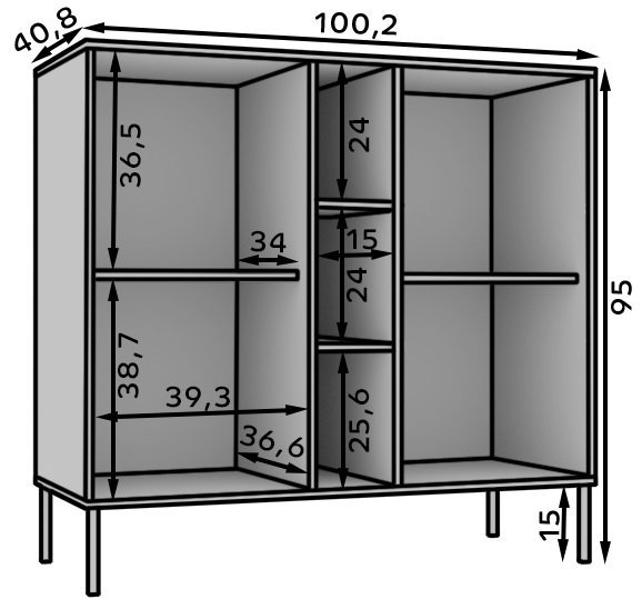 Mit den Maßen 100,2x40,8x95 cm bietet das Möbelstück ein ausgewogenes Verhältnis zwischen Stauraum und kompakter Größe. Die angenehme Höhe ermöglicht es, die obere Fläche als Dekorationsfläche für Pflanzen, Bilder oder Beleuchtung zu nutzen, während das Innere genügend Platz für eine ordentliche Aufbewahrung Ihrer Alltagsgegenstände bietet.