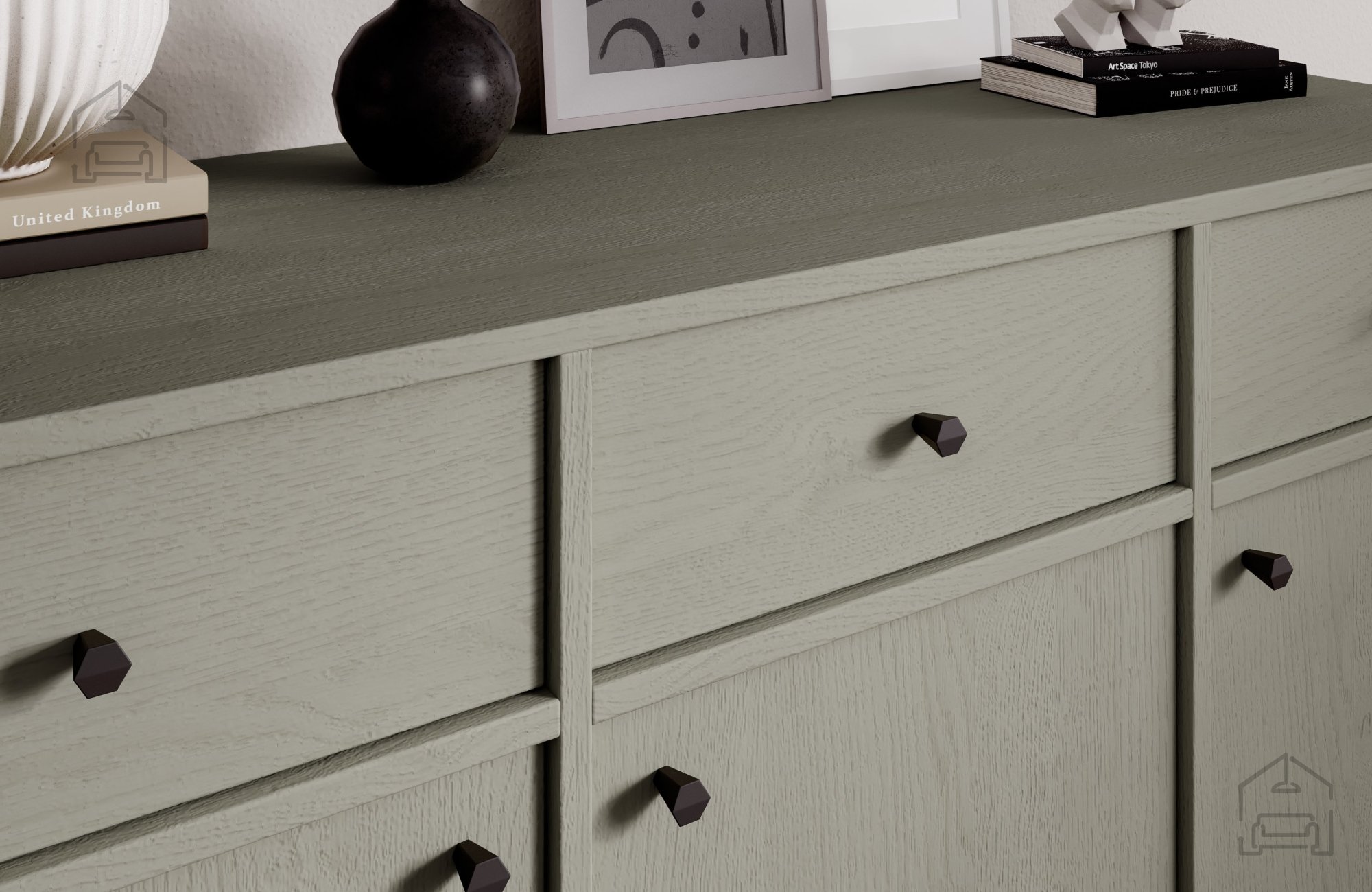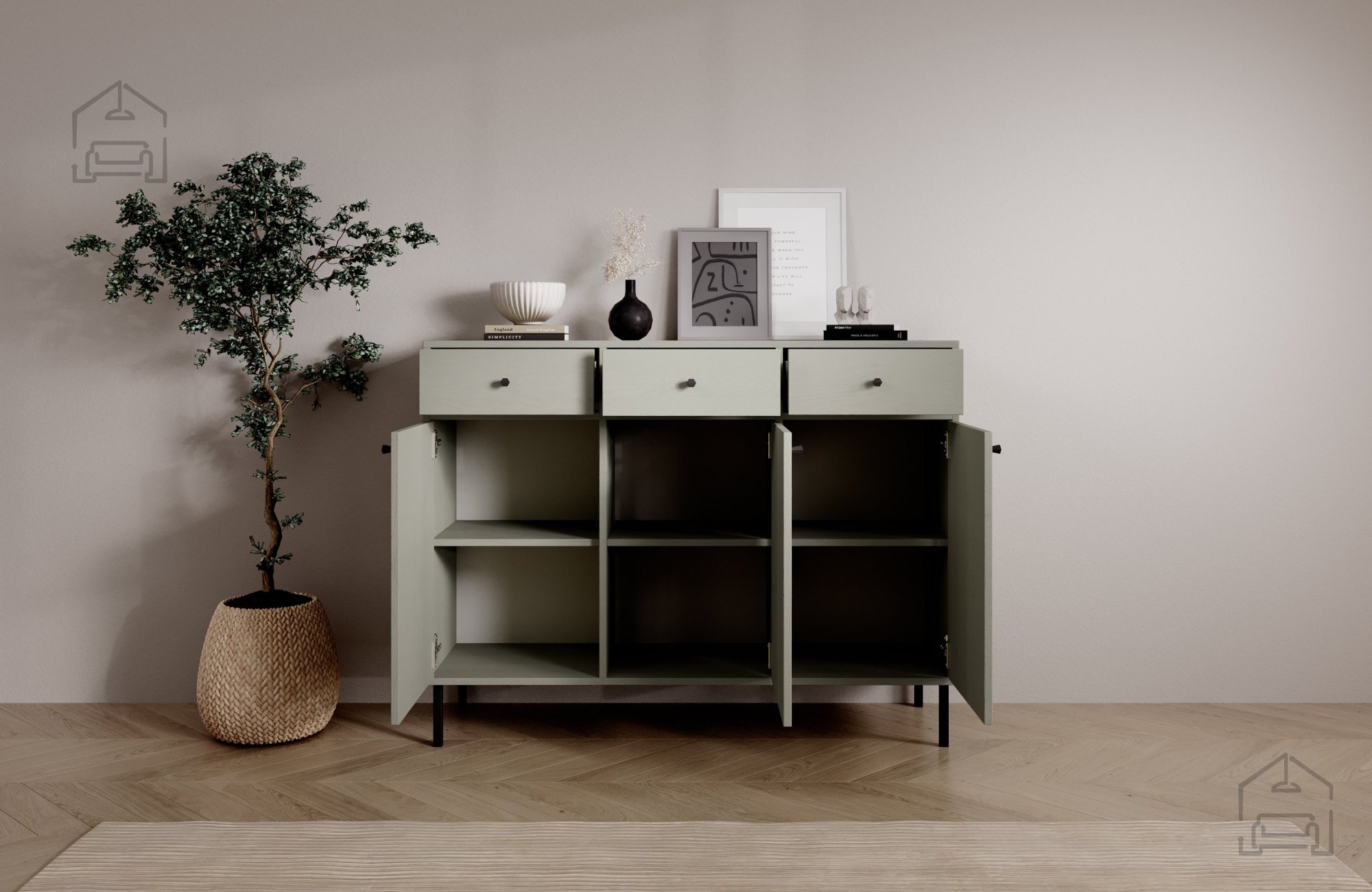 Eukalyptus als Farbton ist ein äußerst beliebter Trend in der Innenraumgestaltung, da er die Wärme von Holz mit einem modernen, dezenten Look verbindet. Die Kommode lässt sich daher wunderbar mit anderen natürlichen Materialien wie Leinen, Baumwolle, Glas oder Metall kombinieren. Ob als zentrales Möbelstück im Raum oder als Teil eines größeren Ensembles – sie sorgt stets für ein wohnliches und stilvolles Ambiente.