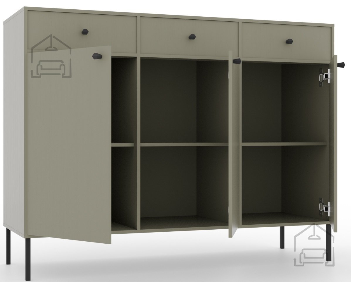 Mit ihren Maßen von 124,5 × 40,8 × 95 cm bietet sie ein ideales Verhältnis zwischen Stauraum und kompakter Größe. Auf der Oberseite lassen sich Dekorationen, Fotos oder Pflanzen stilvoll platzieren, während im Inneren Textilien, Dokumente, Geschirr oder andere Alltagsgegenstände ordentlich verstaut werden können. Drei geräumige Schubladen und drei Türen sorgen dafür, dass alles übersichtlich und griffbereit bleibt.