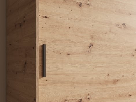 Die klaren Linien und das schlichte Design lassen den Schrank mühelos mit verschiedensten Einrichtungsstilen harmonieren – ob modern, skandinavisch oder klassisch. Die Oberfläche in Artisan-Eiche verleiht dem Raum eine warme, natürliche Ausstrahlung und sorgt für ein gemütliches Wohngefühl. Die integrierten Spiegel an den Türen sind nicht nur ein optisches Highlight, sondern erfüllen auch einen praktischen Zweck: Sie vergrößern den Raum optisch und bringen mehr Helligkeit und Leichtigkeit ins Zimmer.