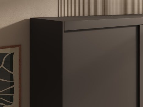 Die schwarze Farbe verleiht dem Schrank eine moderne Note und einen Hauch von Luxus, bleibt dabei aber äußerst praktisch, da sie sich harmonisch mit vielen Farbkombinationen im Raum verbinden lässt. Die 16 mm starke, laminierte Platte sorgt für Stabilität und Langlebigkeit, während die Kunststoffgriffe dezent und funktional sind.
