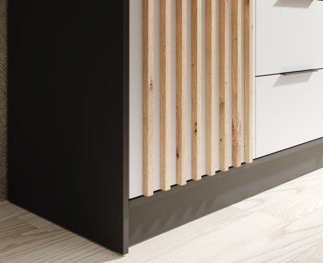 Der Schrank besteht aus einer 16 mm laminierten Platte, die Robustheit, Kratzfestigkeit und Langlebigkeit gewährleistet. Besonders ins Auge fallen die dekorativen Lamellen auf der Front, die dem Möbelstück einen modernen und individuellen Charakter verleihen. Der Spiegel an der Tür ist nicht nur ein optisches Highlight, sondern auch ausgesprochen praktisch – er erleichtert das Ankleiden und lässt kleinere Räume großzügiger erscheinen.