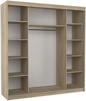 Die Front des Schranks ist mit Spiegeln versehen, die nicht nur optisch ansprechend wirken, sondern den Raum auch größer erscheinen lassen. Das ist besonders praktisch für kleinere Zimmer oder schmale Flure, wo jeder Quadratmeter zählt. Dank der Schiebetüren benötigen Sie keinen zusätzlichen Platz zum Öffnen – so passt der Schrank auch in enge Bereiche, ohne den Raum einzuengen.