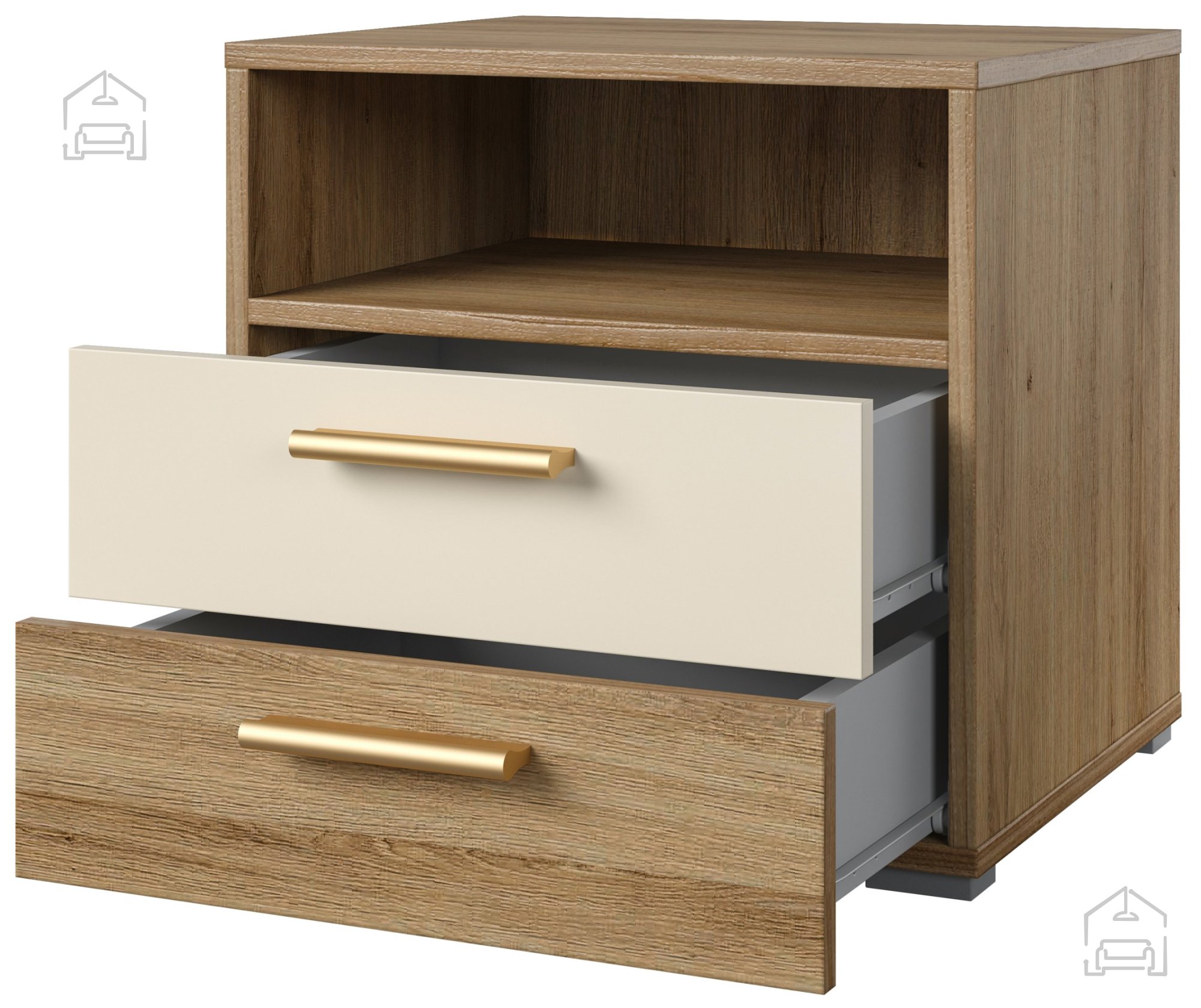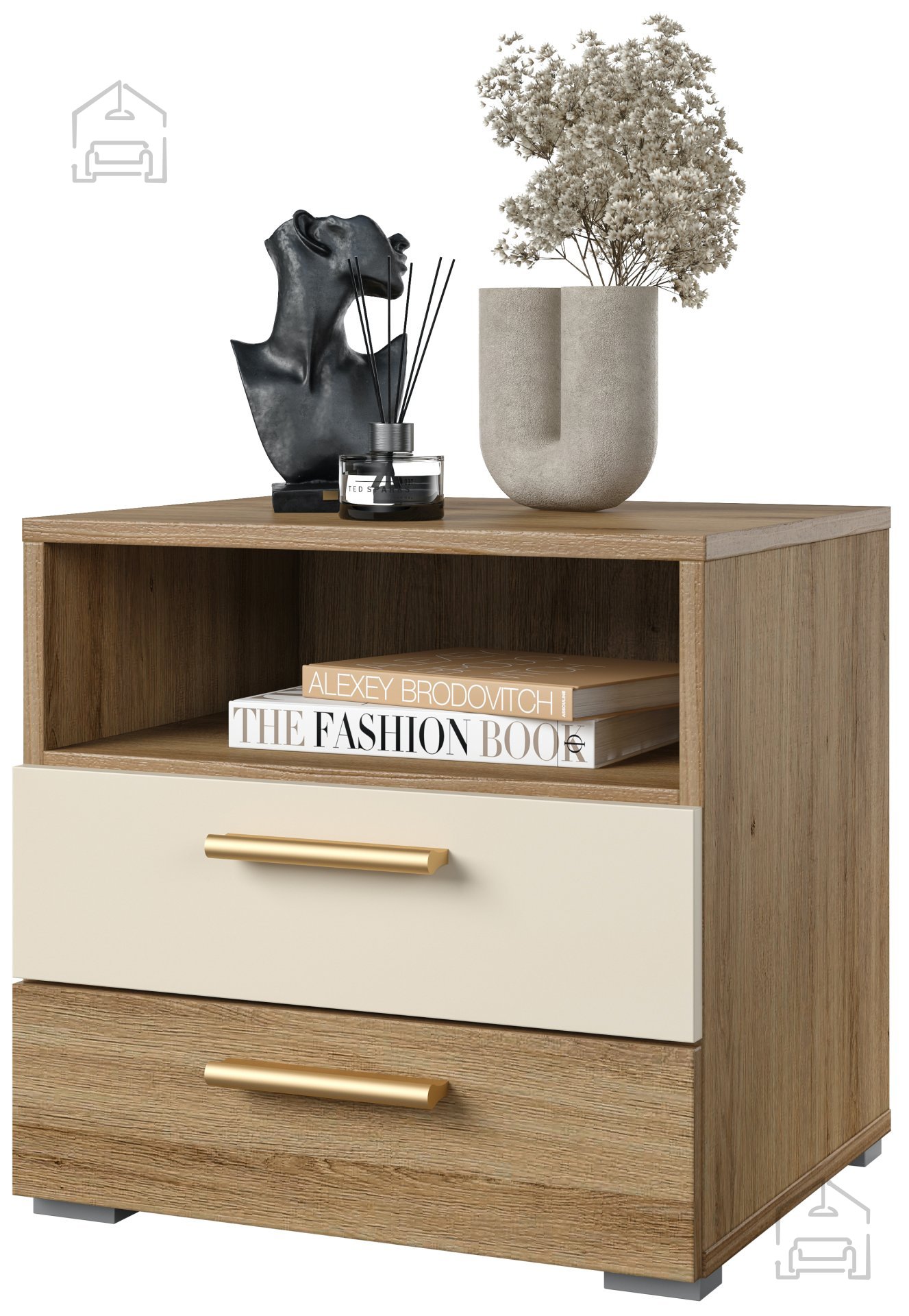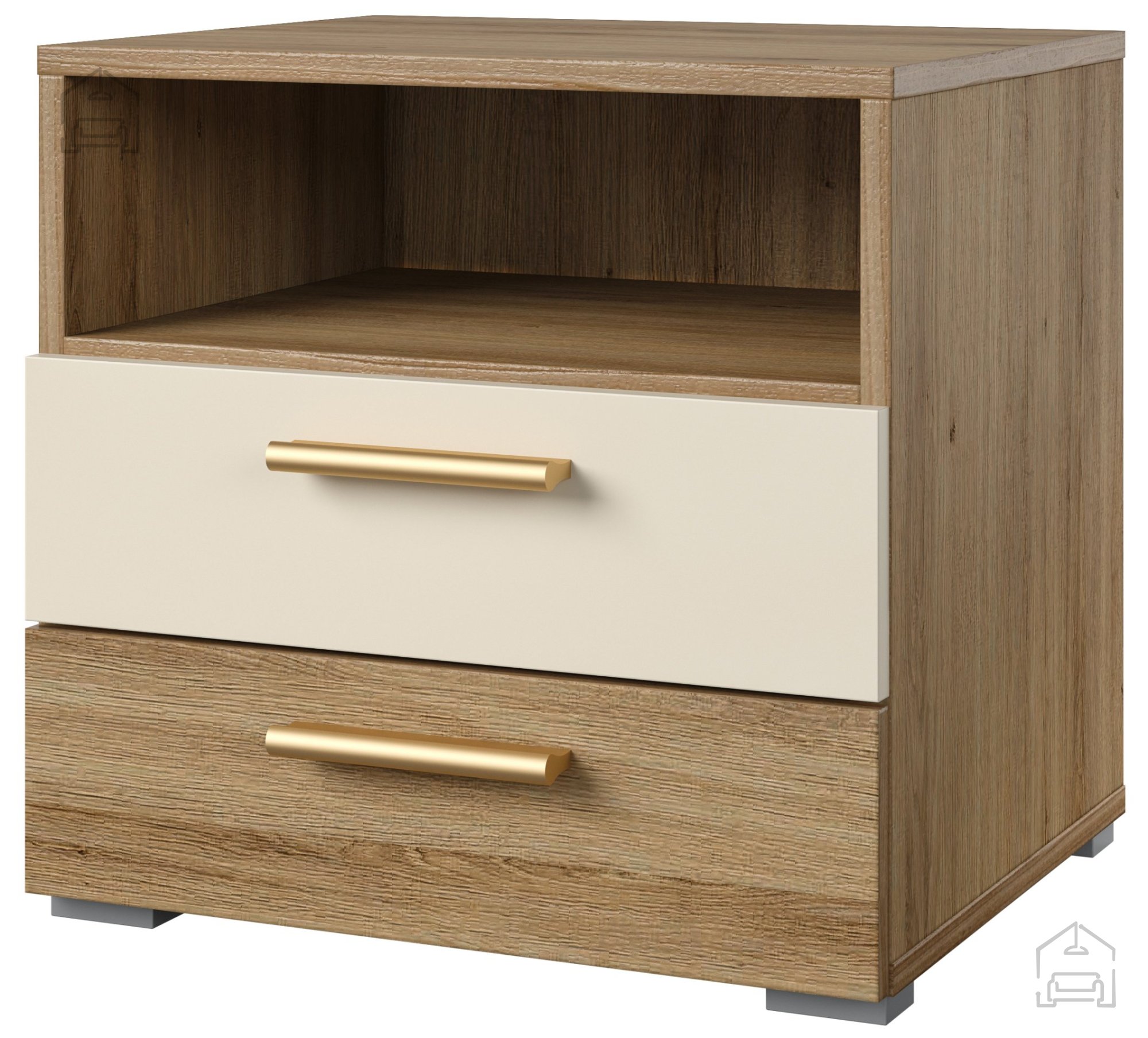 Der Nachttisch Vertina ist in einer wunderschönen Farbkombination aus Wildeiche/Wildeiche - Beige erhältlich und lässt sich dadurch harmonisch in verschiedene Einrichtungsstile integrieren. Die natürliche Holzoptik bringt Wärme und Gemütlichkeit in Ihr Zuhause.