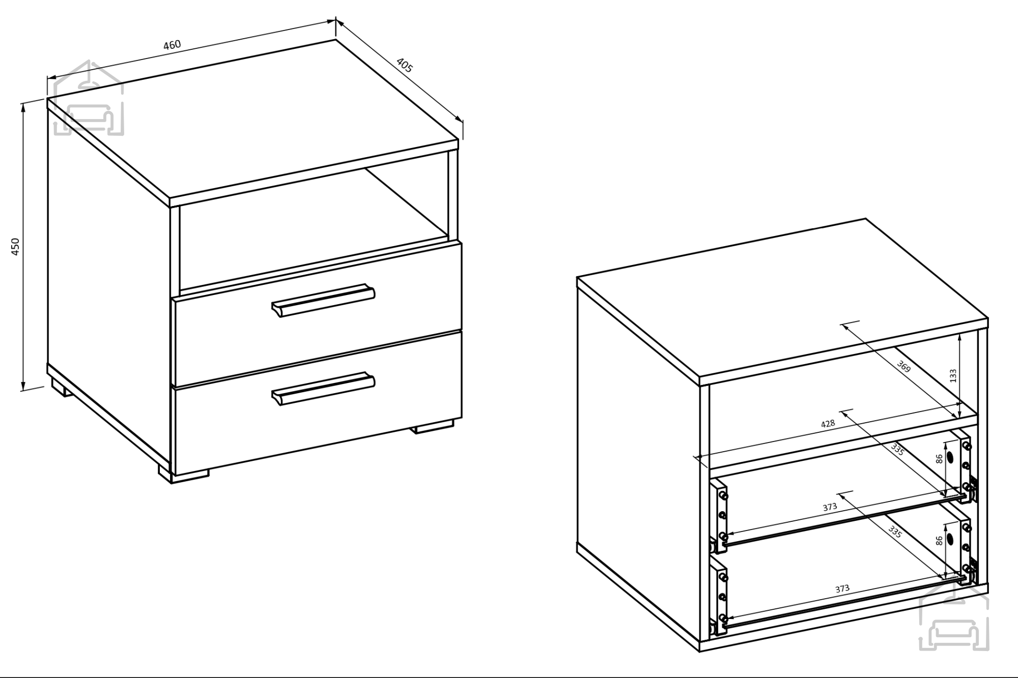 Die Maße des Nachttisches Vertina betragen 46x41x45 cm – ideal sowohl für kleinere als auch für größere Räume. Gefertigt ist er aus einer laminierten Platte mit einer Stärke von 22 mm, was für Stabilität und Langlebigkeit sorgt. Die Rückwand besteht aus einer HDF-Platte mit 3 mm Stärke, die zusätzliche Festigkeit bietet.