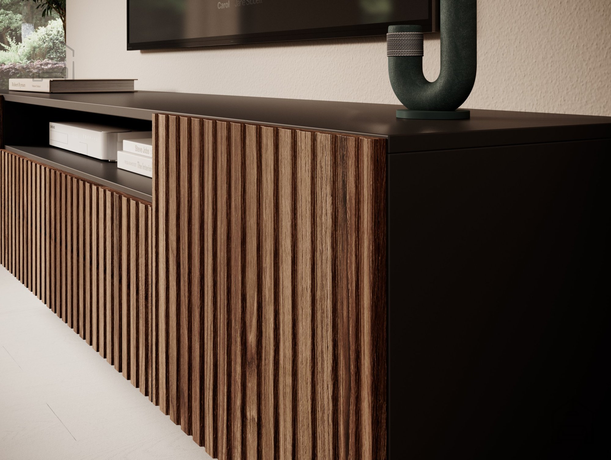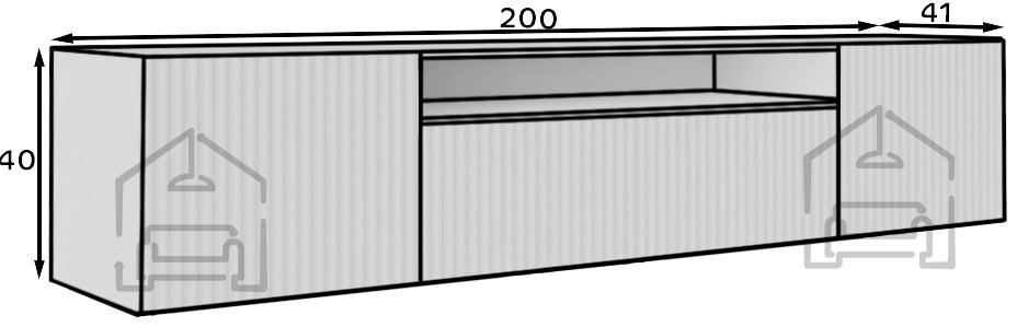 Die RTV-Kommode Miro ist weit mehr als nur ein optisches Highlight – sie ist ein funktionales Möbelstück, das Ordnung und Übersicht schafft. Im Inneren befinden sich großzügige Fächer und praktische Ablagen für elektronische Geräte, Spielkonsolen, Fernbedienungen und anderes Zubehör. Die durchdachte Kombination aus offenen und geschlossenen Bereichen sorgt für eine gute Belüftung der Geräte und ein stets aufgeräumtes Gesamtbild. Mit einer Breite von 200 cm bietet sie ausreichend Platz auch für größere Fernseher, während die Höhe von 40 cm eine angenehme Sichtposition und leichten Zugang gewährleistet.