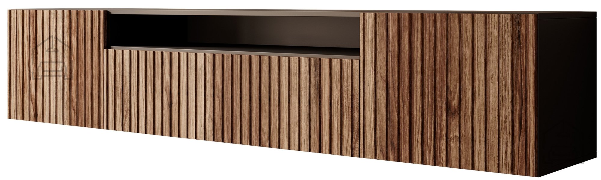 Maße 200 × 40 × 40 cm und eine Kombination aus Schwarz mit Katania-Dekor: die Wand-RTV-Kommode Miro – ADRK. Eine elegante und zugleich praktische Lösung für moderne Wohnzimmer, die minimalistisches Design, langlebige Materialien und eine durchdachte Gestaltung vereint. Mit ihrer ausgewogenen Breite und niedrigen Höhe schafft sie ein Gefühl von Offenheit und bietet gleichzeitig reichlich Platz für alle Multimedia-Geräte und Zubehörteile. Die Oberfläche aus 16 mm starker, laminierten Spanplatte und gefrästen MDF-Elementen mit 18 mm Stärke sorgt für hochwertige Verarbeitung, Strapazierfähigkeit und einfache Pflege. Die Kommode Miro ist in zwei Varianten erhältlich – als stehende oder hängende Ausführung – und passt sich so perfekt an den Stil Ihres Wohnraums und die räumlichen Gegebenheiten an.