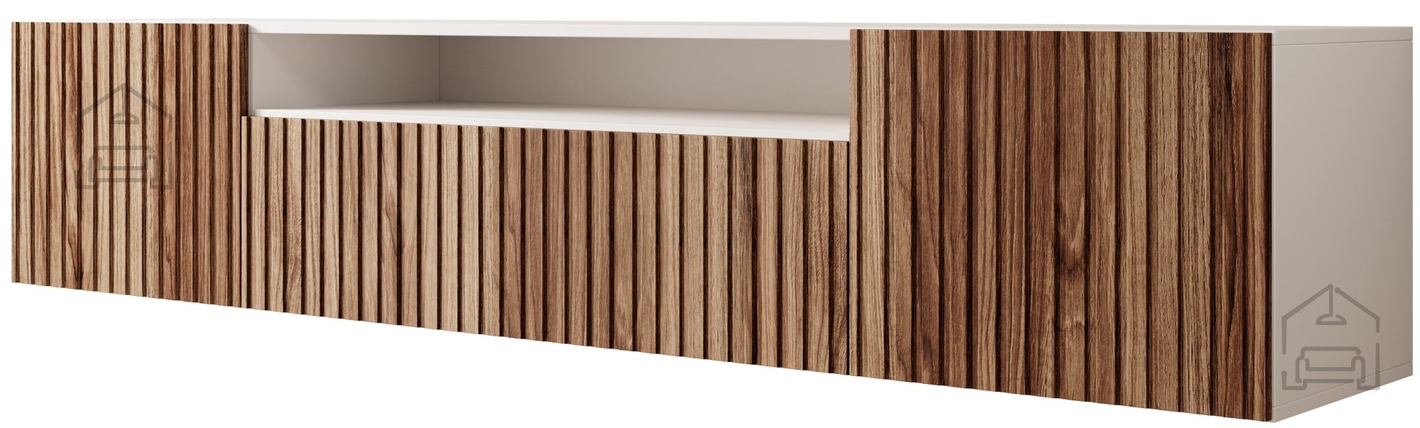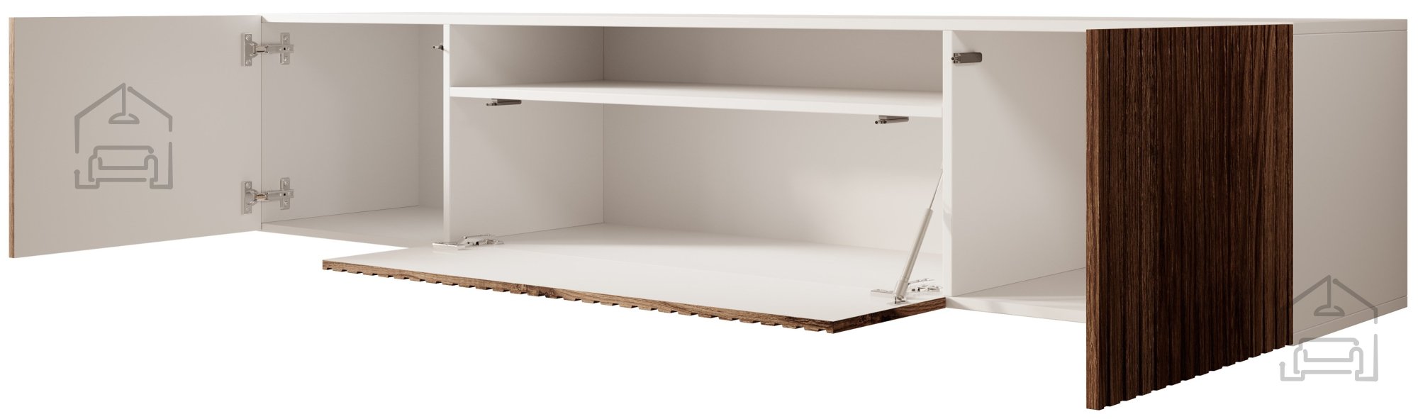 Die elegante und moderne TV-Kommode Miro in der Farbkombination Weiß/Katania ist die perfekte Wahl für alle, die ihrem Wohnzimmer einen Hauch von Modernität, Funktionalität und Ordnung verleihen möchten. Gefertigt aus hochwertiger, 16 mm starker, laminierten Spanplatte und ergänzt durch Details aus 18 mm gefräster MDF-Platte, überzeugt sie durch Stabilität und Langlebigkeit. Die Kombination aus warmem Katania-Holzton und reinem Weiß sorgt für ein harmonisches Gleichgewicht, das sich wunderbar mit verschiedensten Einrichtungsstilen – von minimalistisch über klassisch bis hin zu skandinavisch – kombinieren lässt. Die Kommode wird in Polen von der Marke ADRK mit großer Sorgfalt gefertigt, was für ihre Stabilität und ihr gepflegtes Erscheinungsbild spricht.