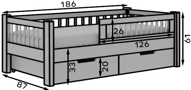 Bei der Auswahl des richtigen Mobiliars fürs Kinderzimmer möchten wir Komfort, Funktionalität und ansprechendes Design miteinander verbinden. Genau deshalb ist dieses Bett die ideale Lösung für Eltern, die ihren Kindern erholsamen Schlaf und gleichzeitig eine praktische Aufbewahrungsmöglichkeit bieten möchten. Mit den Maßen 87x186x61 cm und einer Liegefläche von 80x180 cm ist es perfekt für Kinder unterschiedlichen Alters geeignet – es wächst gewissermaßen mit und bietet sicheren Halt während der ganzen Kindheit.
