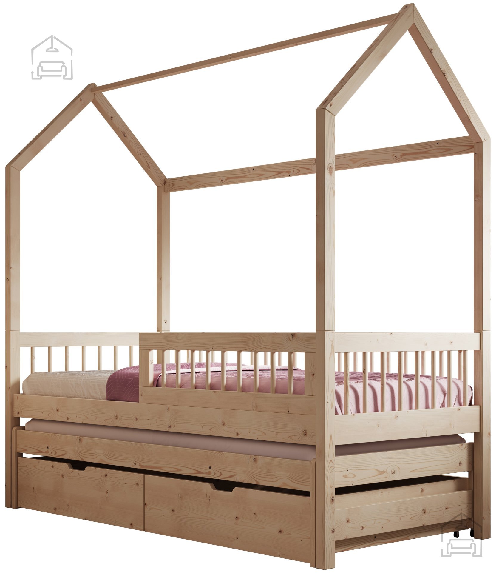 Das Bett verfügt über zusätzliche Schubladen, die dabei helfen, Ordnung zu halten und Bettwäsche, Spielzeug oder andere wichtige Dinge zu verstauen. So bleibt im Zimmer Ihres Kindes mehr Platz zum Spielen und Lernen.