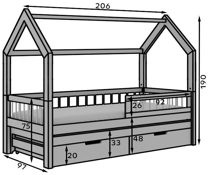 Das Bett ist mit zusätzlichen Schubladen ausgestattet, die helfen, Ordnung zu halten und Bettwäsche, Spielzeug oder andere Dinge des täglichen Bedarfs zu verstauen. So bleibt im Zimmer Ihres Kindes mehr Platz zum Spielen und Lernen.