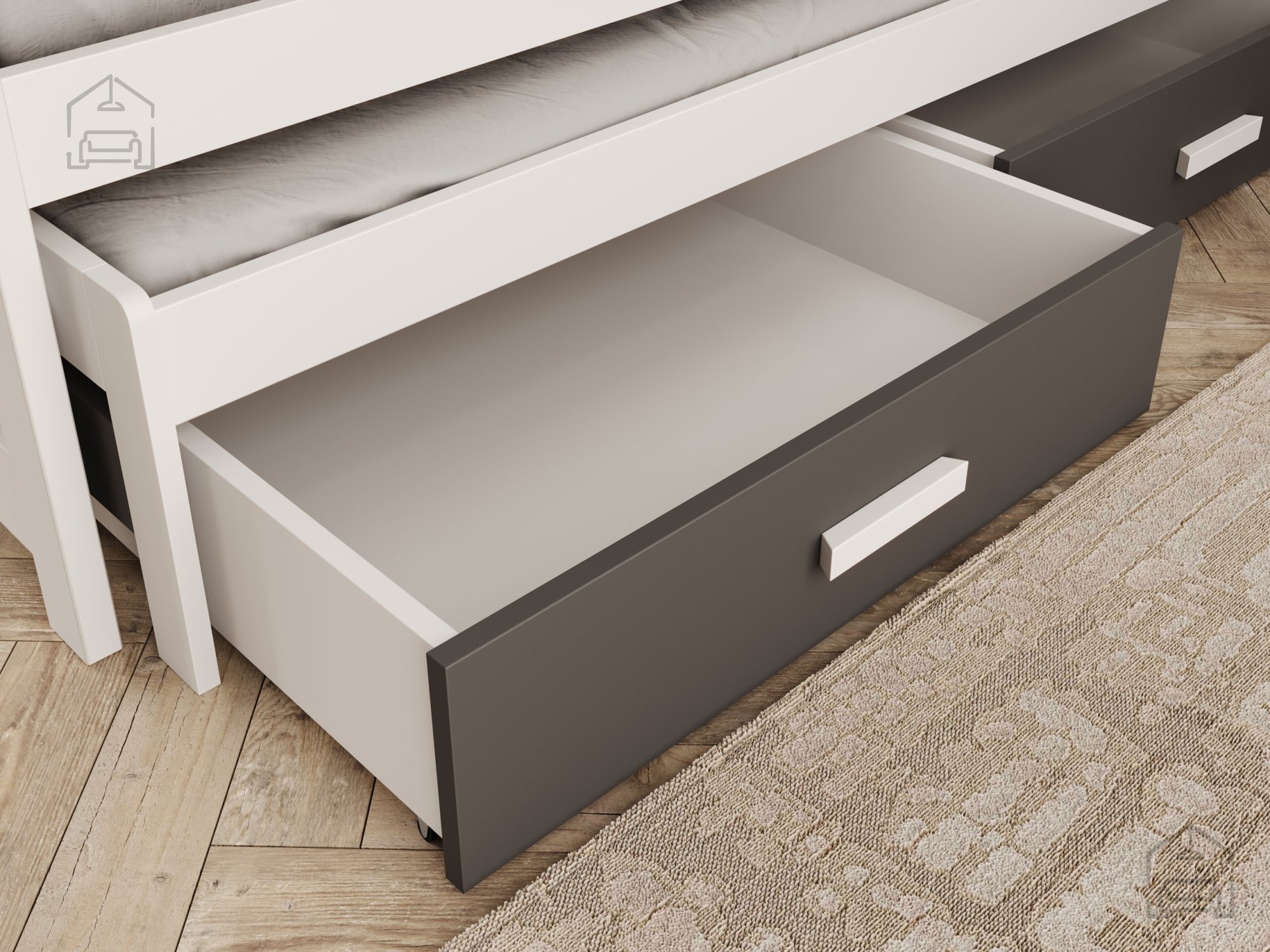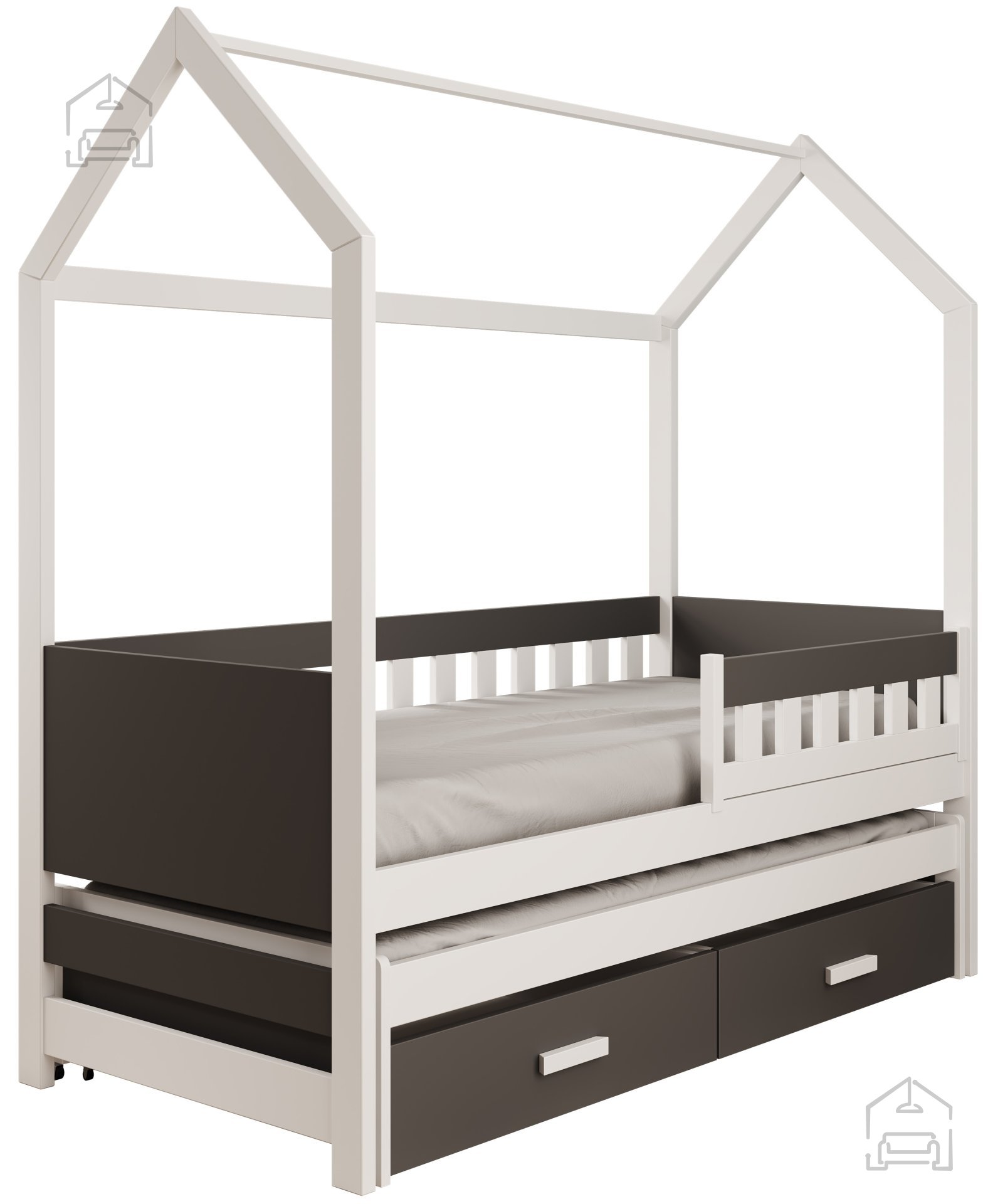 Jedes Kinderzimmer verdient ein Möbelstück, das Praktikabilität, Komfort und ein ansprechendes Design vereint. Genau deshalb ist dieses Bett eine hervorragende Wahl für Eltern, die ihrem Kind einen erholsamen Schlaf ermöglichen und zugleich für Ordnung und optimale Raumnutzung sorgen möchten. Durch die zweifarbige Kombination aus Weiß und Anthrazit fügt es sich harmonisch in moderne wie auch klassische Einrichtungen ein und wird schnell zum Blickfang des Kinderzimmers.