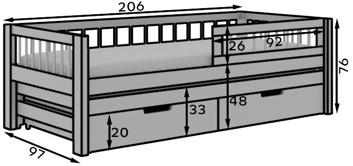 Das Kinderbett Orio ist die ideale Lösung für Geschwister oder Kinder, die etwas mehr Platz benötigen. Das Doppelbett ist in zwei Größen erhältlich: 180x80 cm und 200x90 cm, sodass es sich leicht an unterschiedliche Bedürfnisse und Raumgrößen anpassen lässt. Dieses Bett bringt Komfort und Funktionalität in jedes Zuhause.