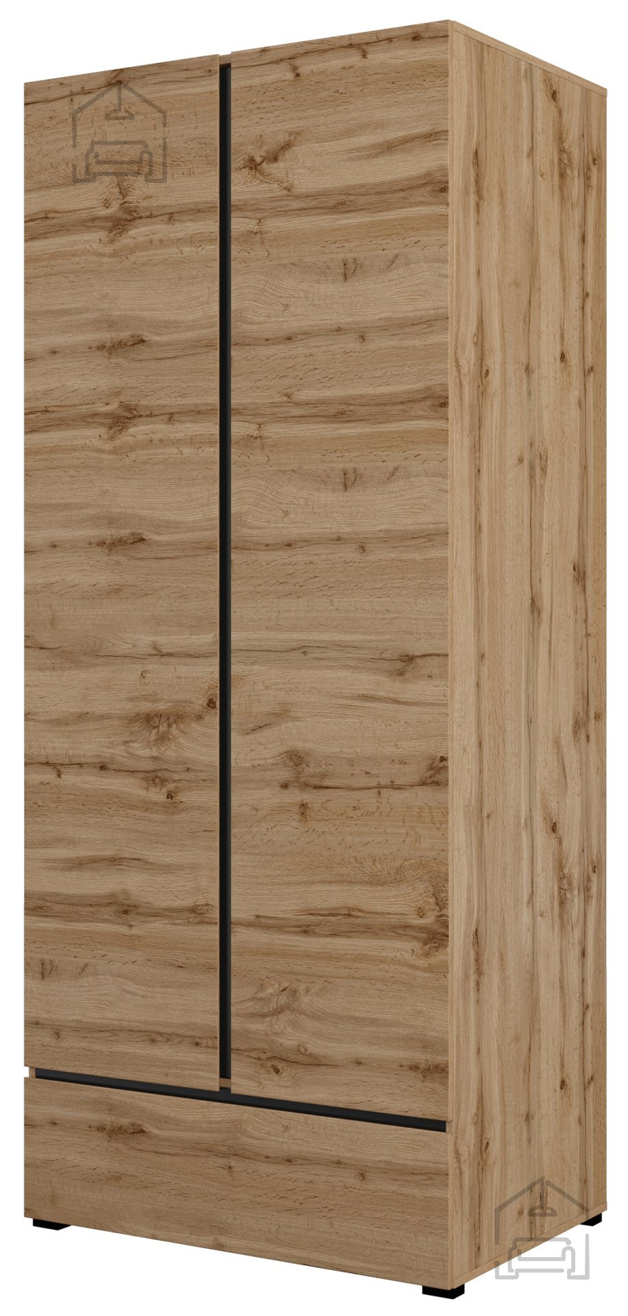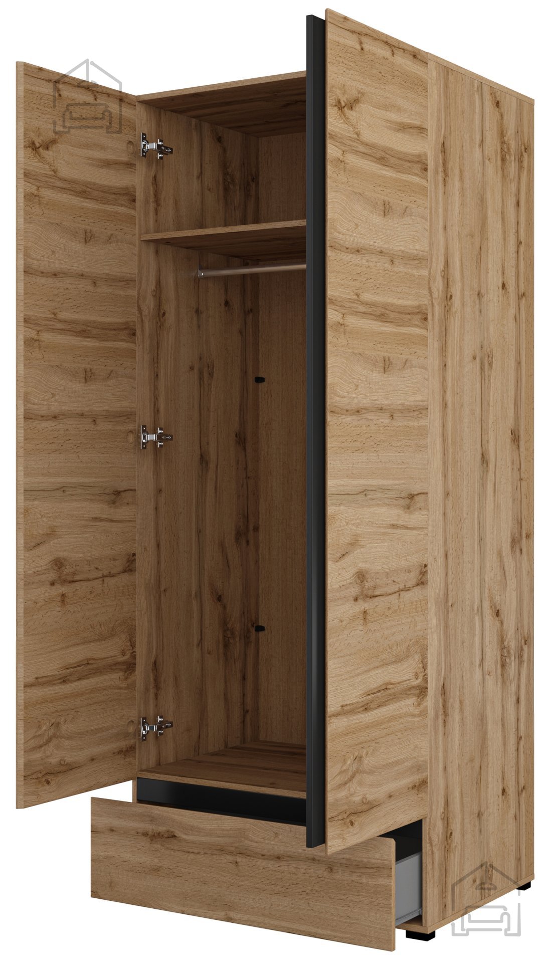 Der Kleiderschrank Cross S ist die ideale Lösung für alle, die in ihrem Zuhause Wert auf Funktionalität und ein ansprechendes Design legen. Mit seinen Maßen von 89x60x210 cm ist er so konzipiert, dass er den vorhandenen Platz optimal nutzt und gleichzeitig ausreichend Stauraum für Kleidung und Accessoires bietet. Die Kombination aus Wotan-Eiche und Wotan-Eiche-Schwarz verleiht ihm ein modernes, elegantes Erscheinungsbild, das sich harmonisch in verschiedene Einrichtungsstile einfügt.