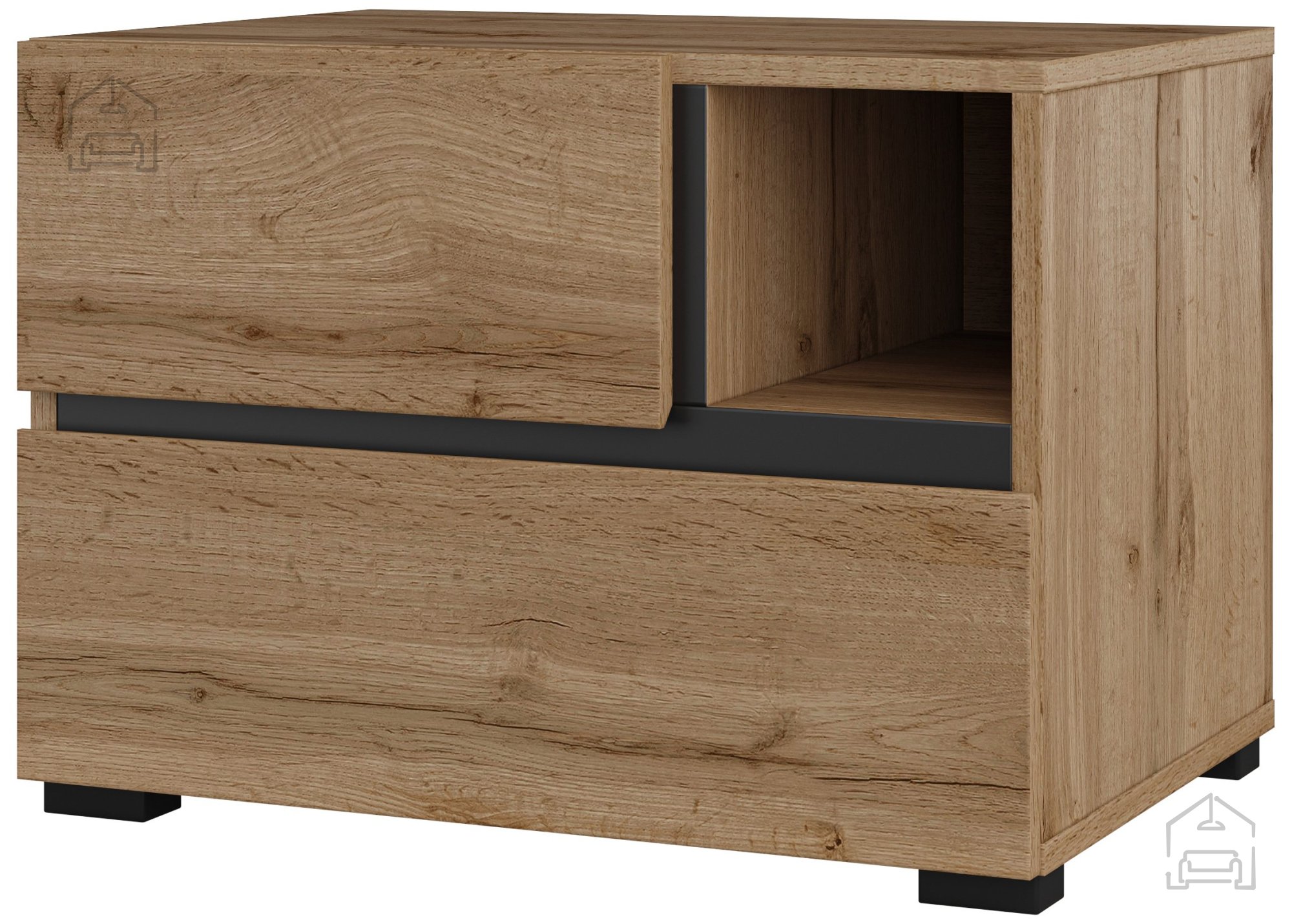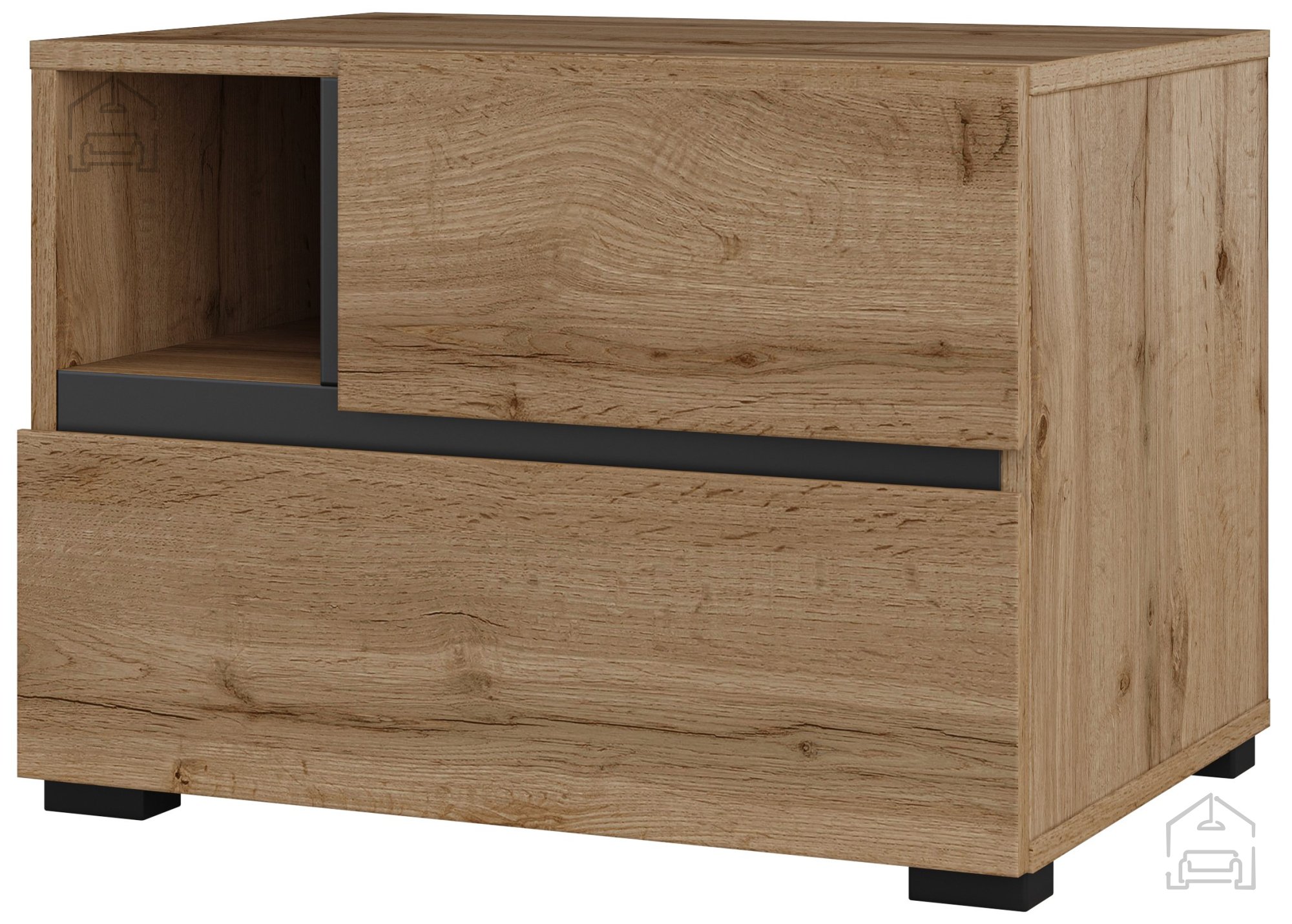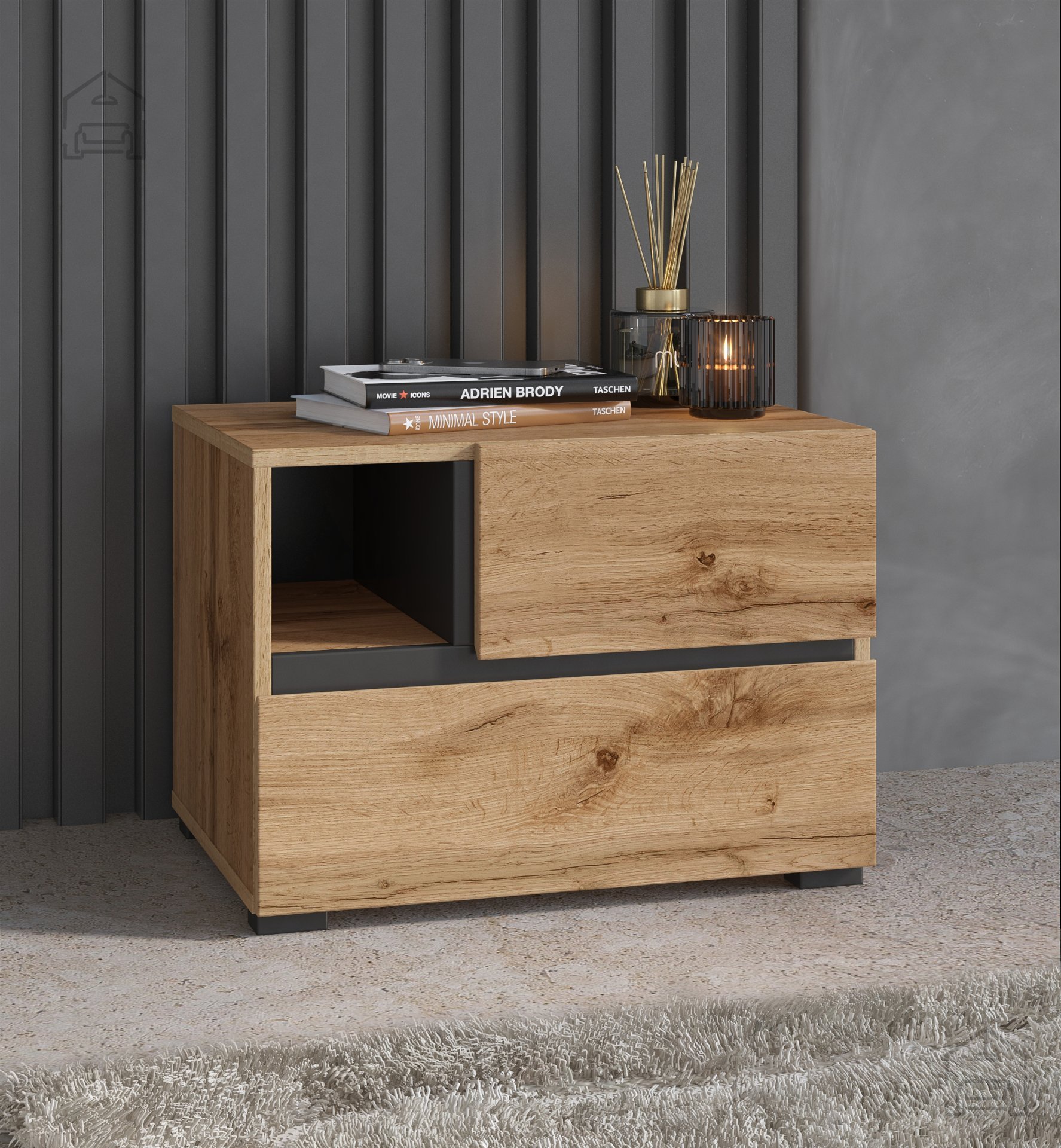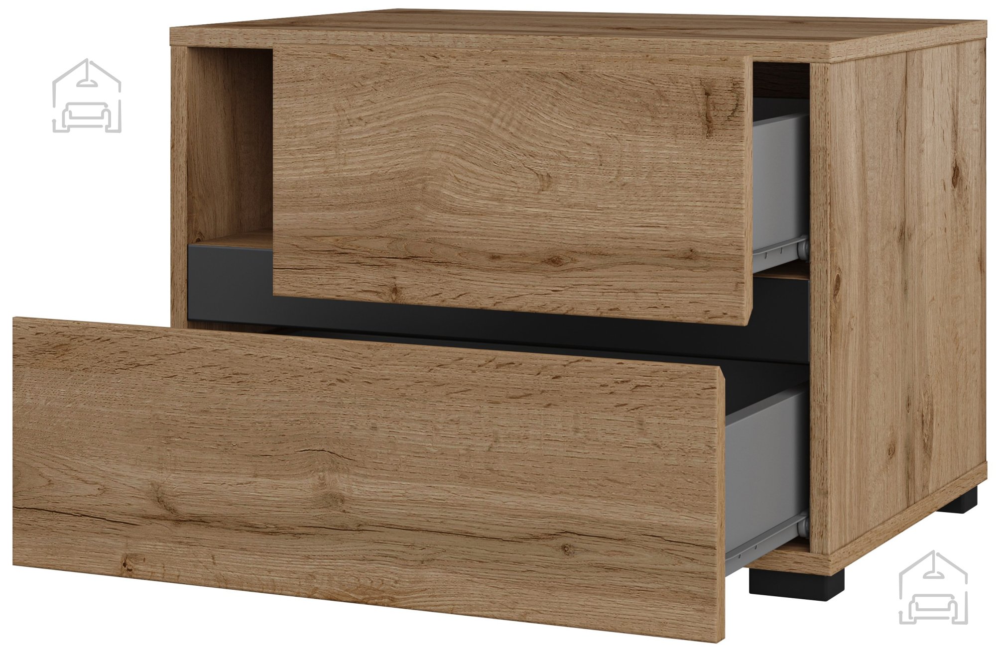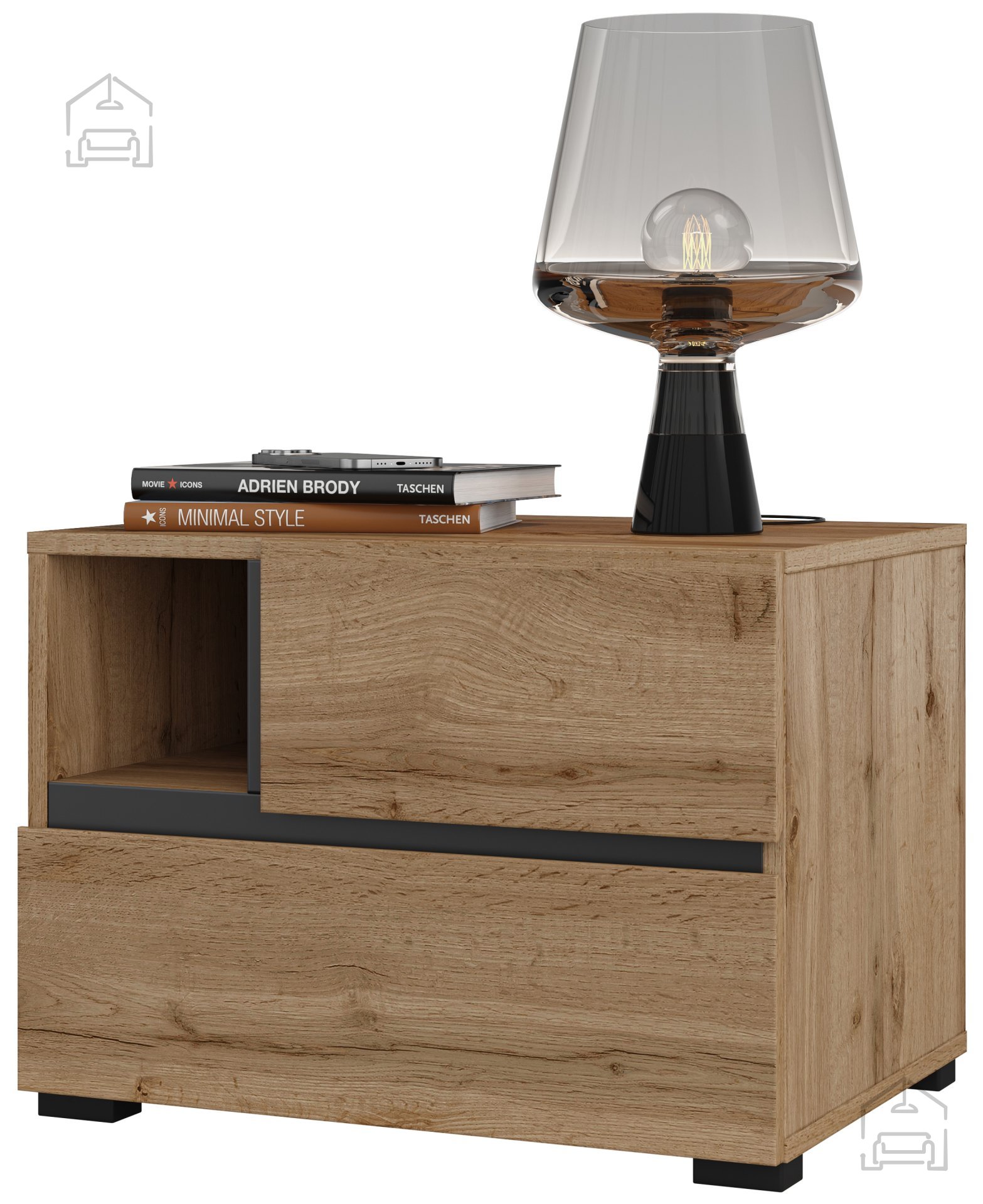 Das Nachtkästchen Cross S präsentiert sich in der eleganten Farbvariante Eiche Votan/Eiche Votan-Schwarz, die ihm einen modernen, stilvollen Charakter verleiht. Diese Farbkombination lässt sich mühelos mit verschiedensten Einrichtungsstilen – von skandinavisch bis industriell – kombinieren und fügt sich harmonisch in jedes Schlafzimmer ein.