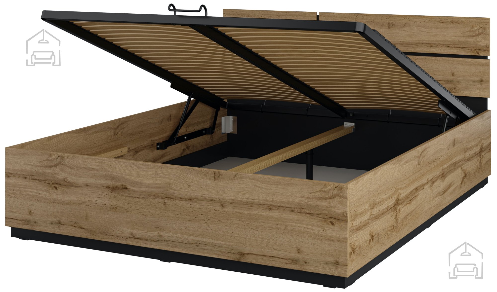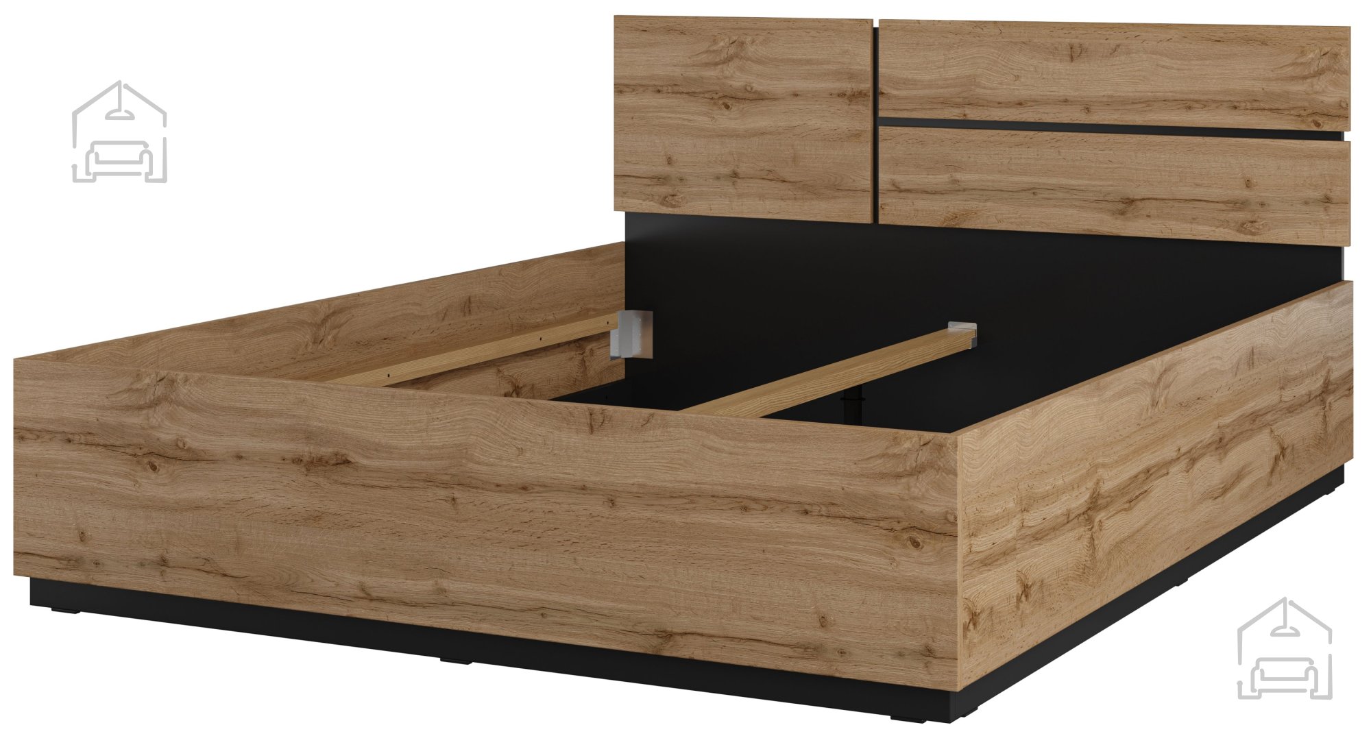 Das Bett ist in der Farbkombination Wotan Eiche / Wotan Eiche-Schwarz erhältlich, die ihm ein modernes und stilvolles Aussehen verleiht. Diese Farbgestaltung passt wunderbar zu verschiedensten Einrichtungsstilen – von klassisch bis zeitgemäß. Klare Linien und das minimalistische Design bringen einen Hauch von Eleganz und schaffen eine angenehme Atmosphäre im Schlafzimmer.
