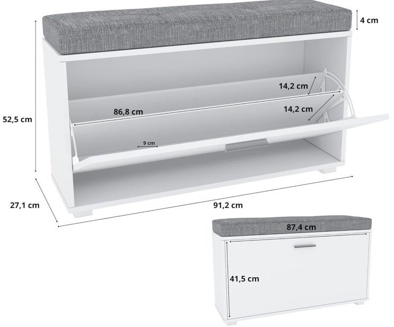 Der Schuhschrank Pelago 91 besticht durch ein modernes Design, das sich mühelos in verschiedene Innenräume einfügt. Seine Farbkombination Weiß/Grau ergänzt jeden Stil und Raum, vom minimalistischen bis zum klassischen. Die gepolsterte Oberseite aus grauem Stoff aus 100% Polyester verleiht einen Hauch von Komfort und Eleganz, ideal zum Anziehen Ihrer Lieblingsschuhe.