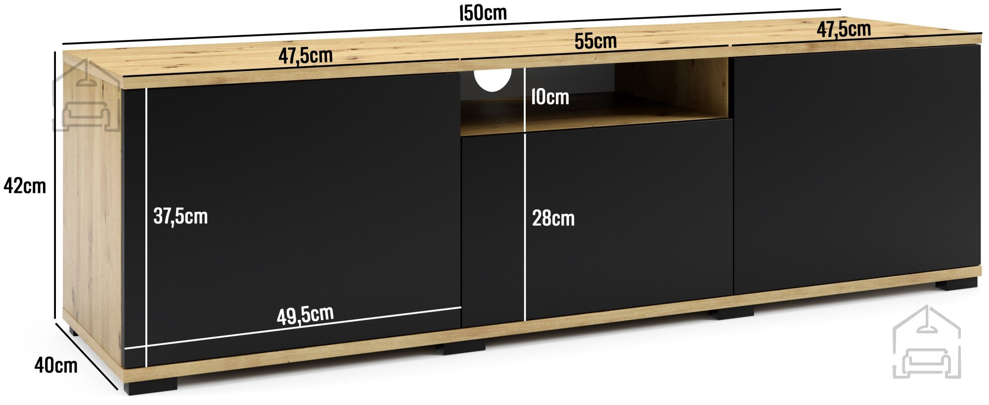 Dimenzije 150x40x42 cm naredijo to komodo popolno rešitev za manjše in srednje velike dnevne sobe. S svojo kompaktno zasnovo zagotavlja dovolj prostora za vaš televizor ter dodatke, kot so sprejemniki, igralne konzole in medijski predvajalniki. Viseča zasnova omogoča preprosto čiščenje tal in daje prostoru občutek zračnosti.