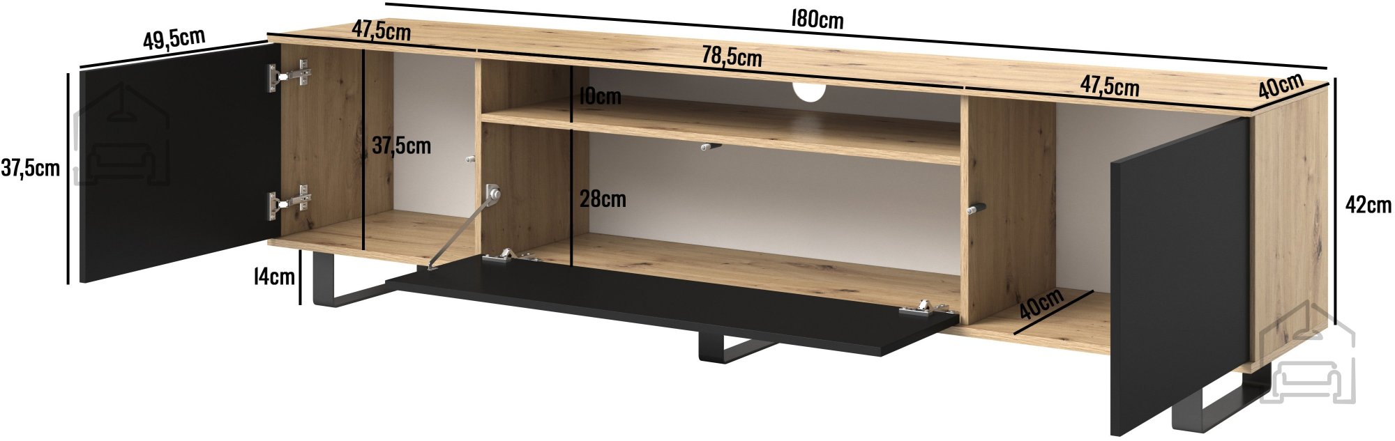 2. Prostornost in Organizacija: Z dimenzijami 180x40x56 cm ta komoda nudi obilo prostora za vašo televizijo, igralne konzole, DVD predvajalnike ali druge elektronske naprave. Poleg tega ima dovolj prostora za shranjevanje revij, knjig in drugih dodatkov, ki jih želite imeti pri roki.