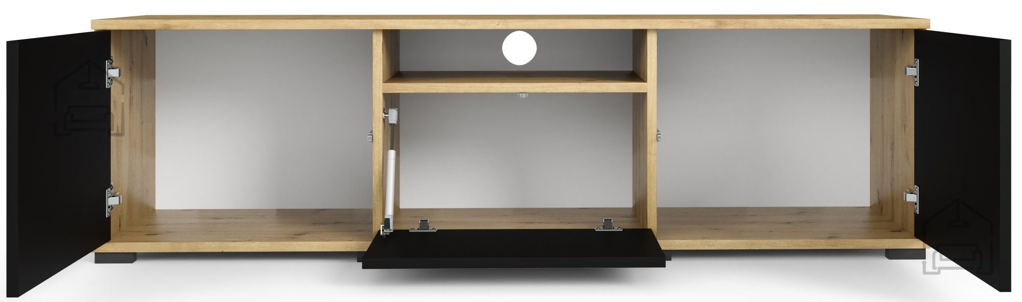 TV komoda Logan je izdelana iz visokokakovostne laminirane iverne plošče, ki zagotavlja trajnost in dolgo življenjsko dobo. Barvna kombinacija artisan hrasta in črne barve prinaša sodoben in edinstven izgled, ki se zlahka prilagodi različnim stilom notranje opreme. Laminirana površina omogoča enostavno čiščenje in vzdrževanje, kar pomeni, da bo vaša komoda vedno videti kot nova.