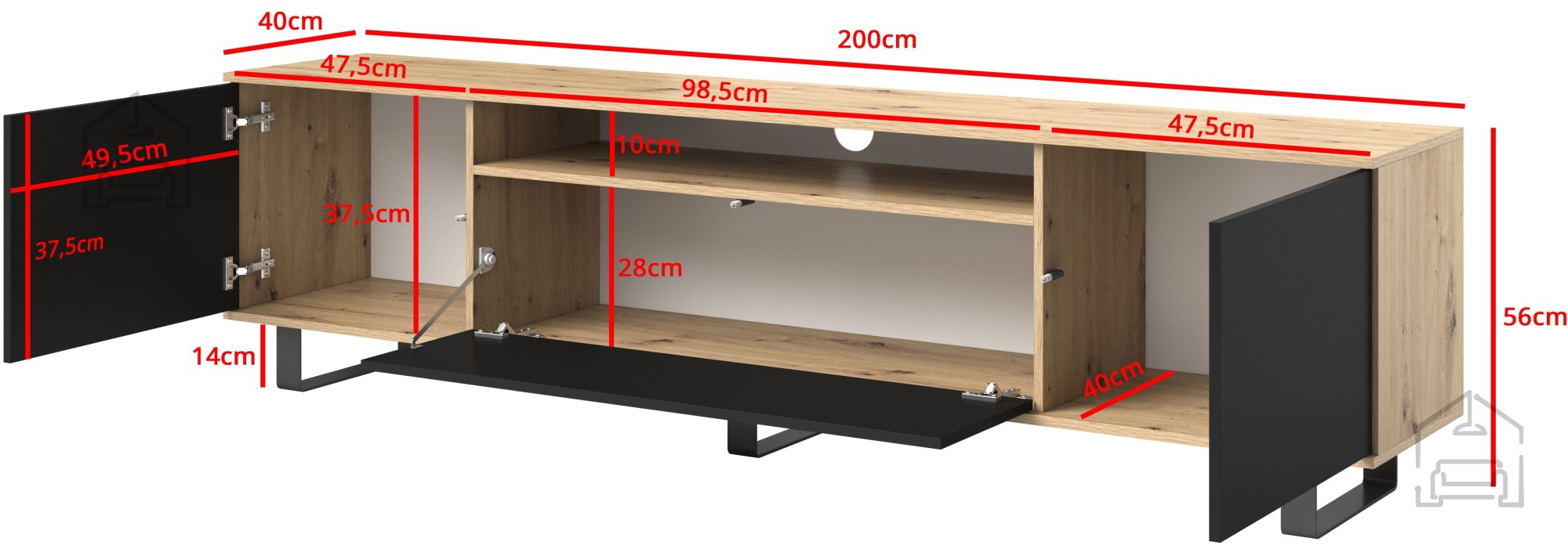 Ganz gleich, ob Sie Ihr Zuhause renovieren oder einfach nur alte Möbel ersetzen möchten – die TV-Kommode Logan 200 cm - Artisan Eiche/Schwarz ist die perfekte Wahl, die Haltbarkeit, Funktionalität und einzigartiges Design vereint. Lassen Sie Ihr Zuhause den Ausdruck Ihres persönlichen Stils sein mit unserer außergewöhnlichen TV-Kommode, die alles vereint, was Sie für ein perfektes Zuhause benötigen. Zögern Sie nicht, investieren Sie in Qualität, die lange hält.