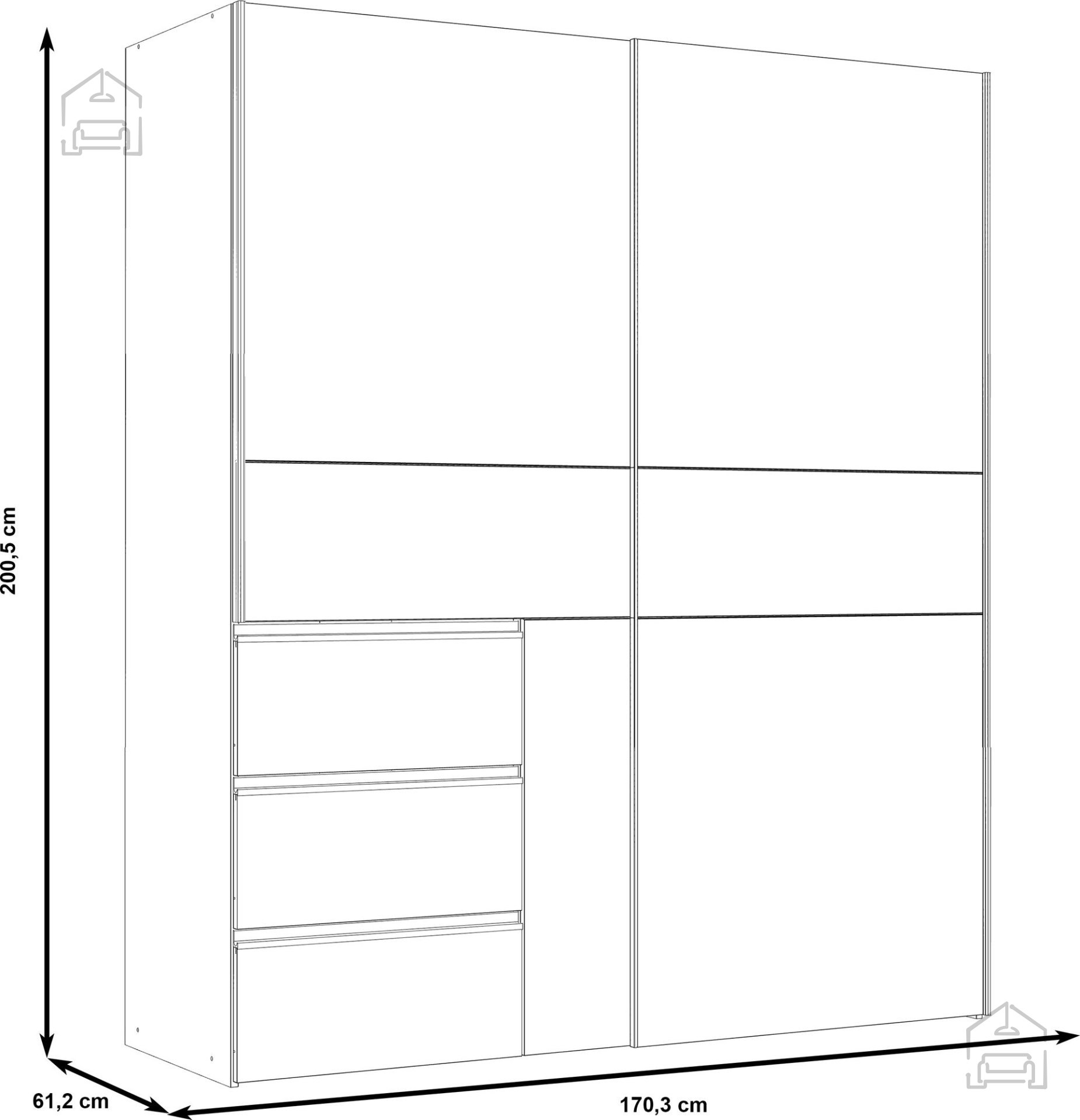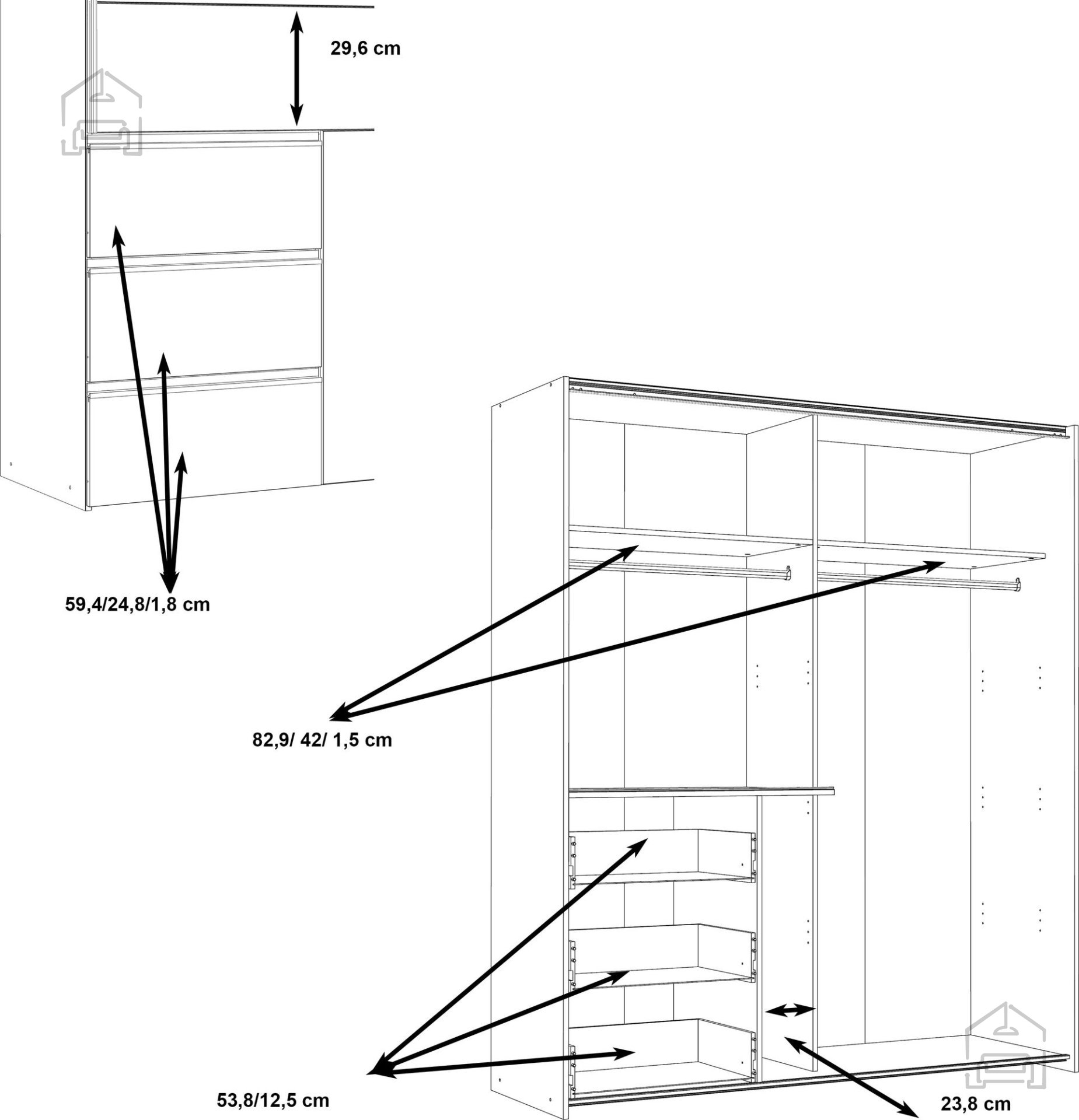Schiebetüren: Der Schrank ist mit Schiebetüren ausgestattet, die nicht nur Platz sparen, sondern auch einen einfachen Zugang zu Ihrer Kleidung und Ihren Accessoires ermöglichen. Dies ist die ideale Lösung für kleinere Schlafzimmer oder Räume, in denen jeder Zentimeter zählt.