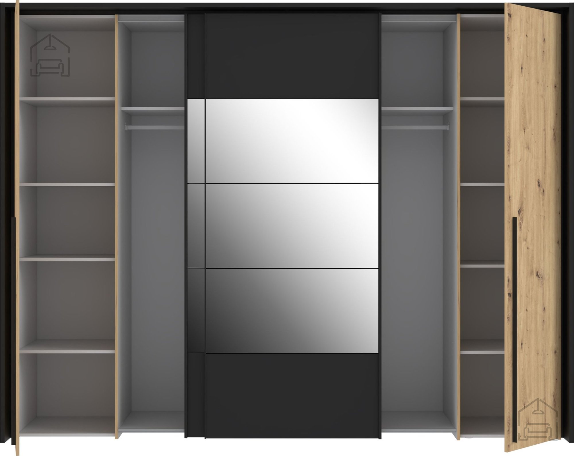 Der mittlere Teil des Schranks ist mit Schiebetüren versehen, die ein mehrteiliges Spiegelpaneel enthalten. Dieses Spiegel-Element ist nicht nur praktisch, sondern lässt den Raum auch größer und heller wirken. Jeder mittlere Abschnitt verfügt über einen Einlegeboden mit einer Tragkraft von bis zu 15 kg sowie eine Kleiderstange, die bis zu 25 kg belastbar ist. So können Sie auch schwere Kleidungsstücke wie Mäntel oder Jacken problemlos aufhängen.
