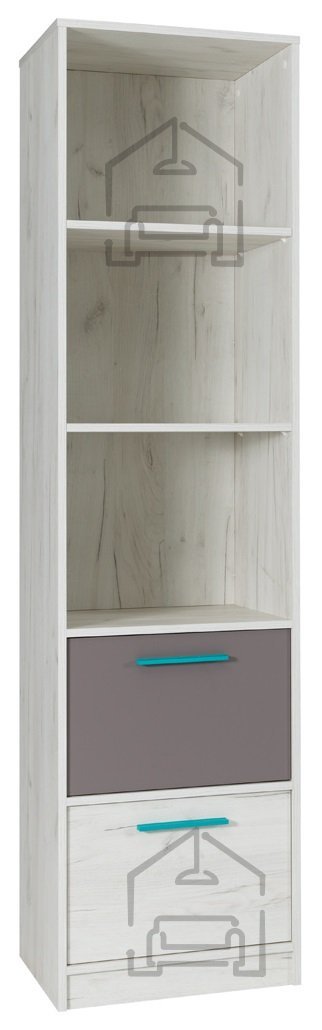 Das Regal ist in einer eleganten Farbkombination aus weißer Craft-Eiche und Grau erhältlich, die sich mühelos in verschiedene Einrichtungsstile einfügt – von minimalistisch bis klassisch. Darüber hinaus haben Sie die Möglichkeit, die Farbe der Griffe zu wählen, wodurch Sie das Regal an Ihren persönlichen Geschmack und den Stil des Raumes anpassen können. Zur Auswahl stehen Türkis (01), Grau (02), Gelb (03) und Rosa (04).