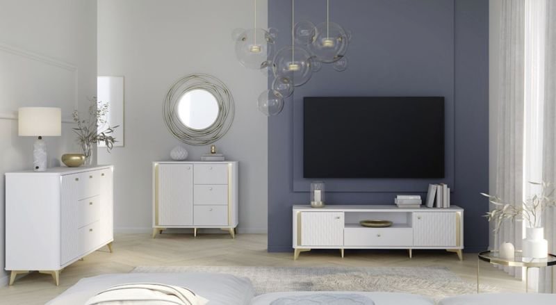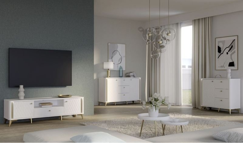 Die Kombination aus Weiß und goldenen Akzenten verleiht der Kommode Forrest Hills 232 einen Hauch von Luxus und Eleganz. Die abgerundeten Ecken tragen nicht nur zu einem weicheren Erscheinungsbild bei, sondern reduzieren auch das Verletzungsrisiko, was besonders in Haushalten mit kleinen Kindern wichtig ist. Goldene Griffe und Metallfüße ergänzen das Gesamtbild und verleihen dem Möbelstück ein elegantes und raffiniertes Aussehen.