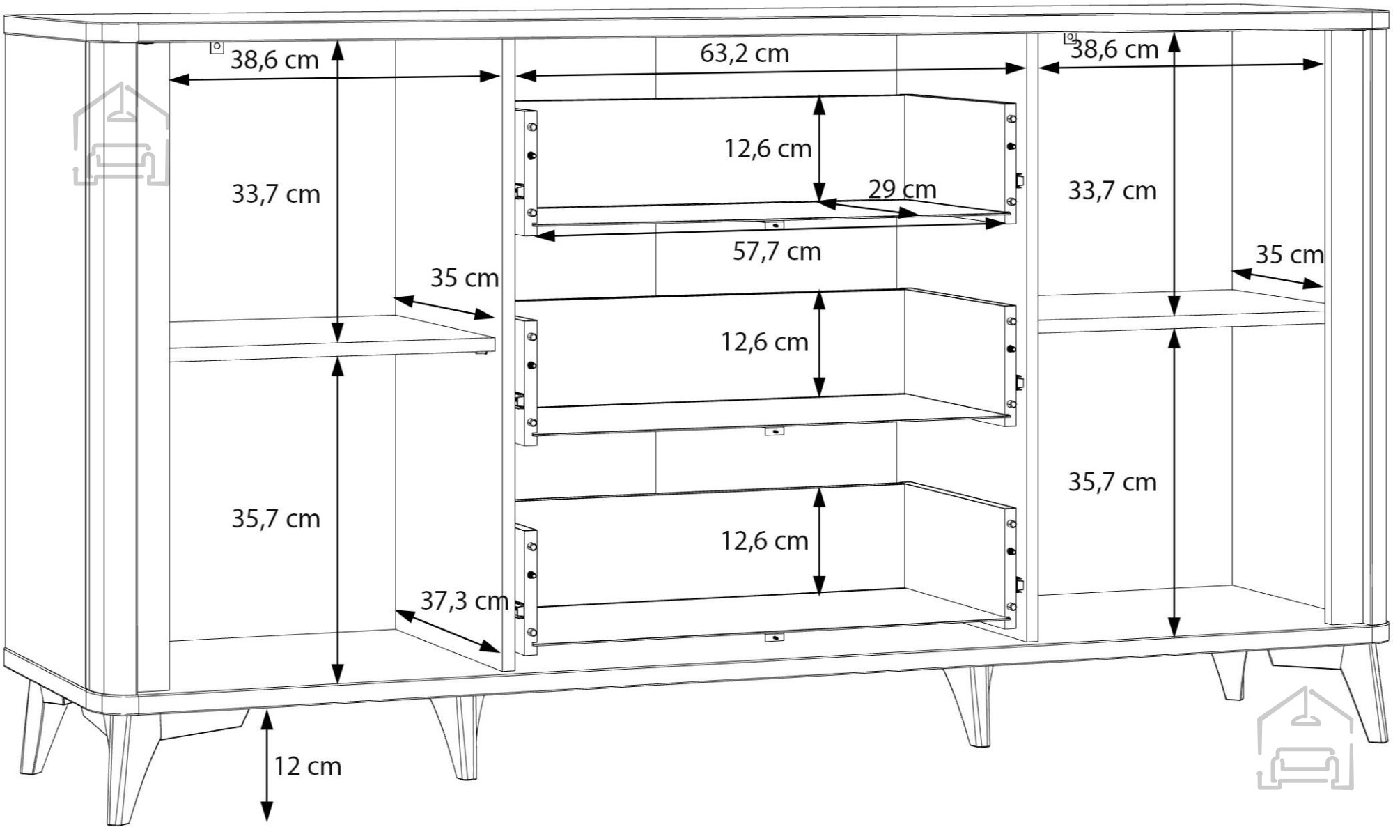 Der mittlere Teil der Kommode Forrest Hills 232 ist mit drei gleich großen Schubladen ausgestattet, die auf Metallschienen montiert sind. Diese Schubladen sind 12,6 cm hoch und 57,7 cm breit, was die Aufbewahrung verschiedener Gegenstände ermöglicht – von kleineren Kleidungsstücken bis hin zu Dokumenten und persönlichen Gegenständen. Die Schubladen sind so konstruiert, dass sie bis zu 5 kg tragen können, was die sichere Aufbewahrung Ihrer Gegenstände gewährleistet.