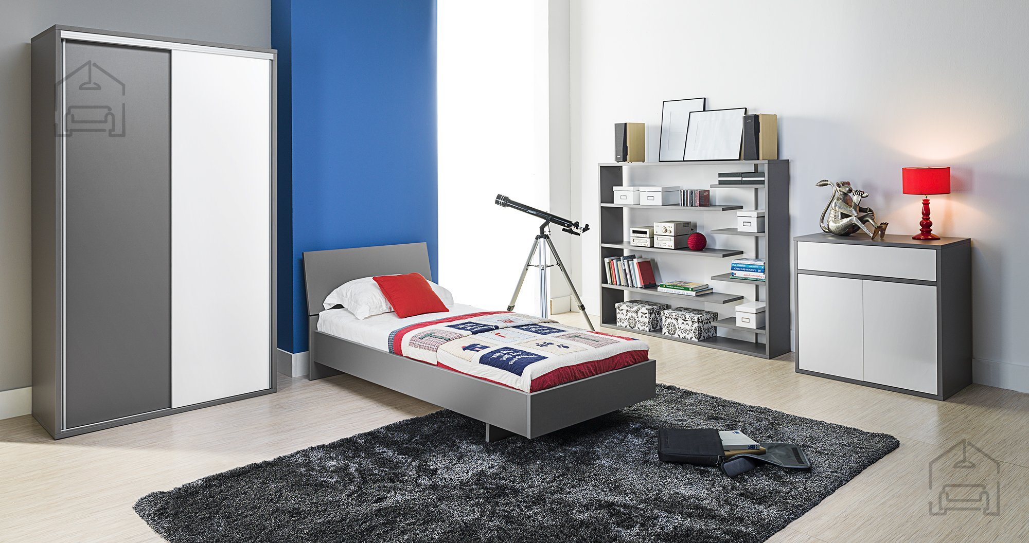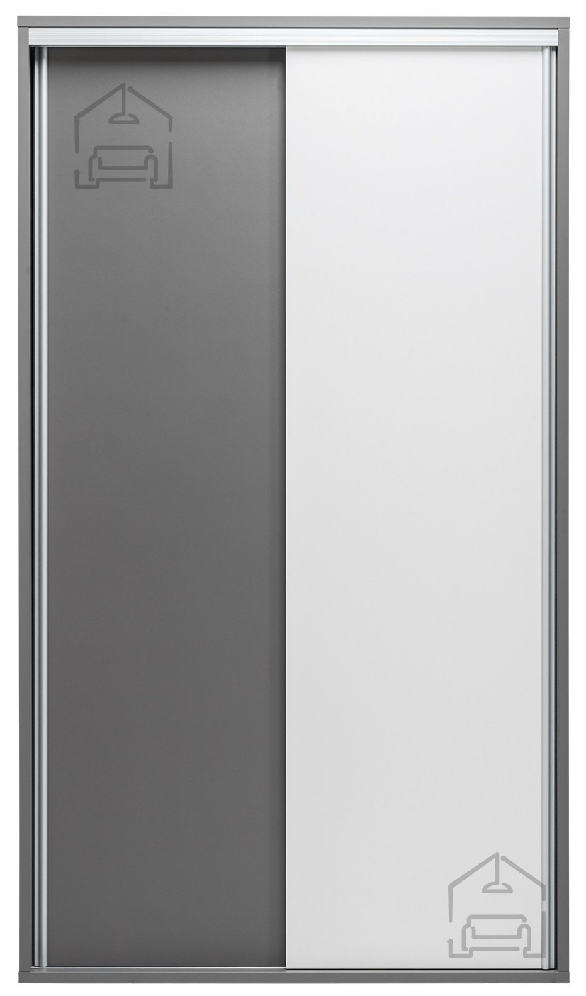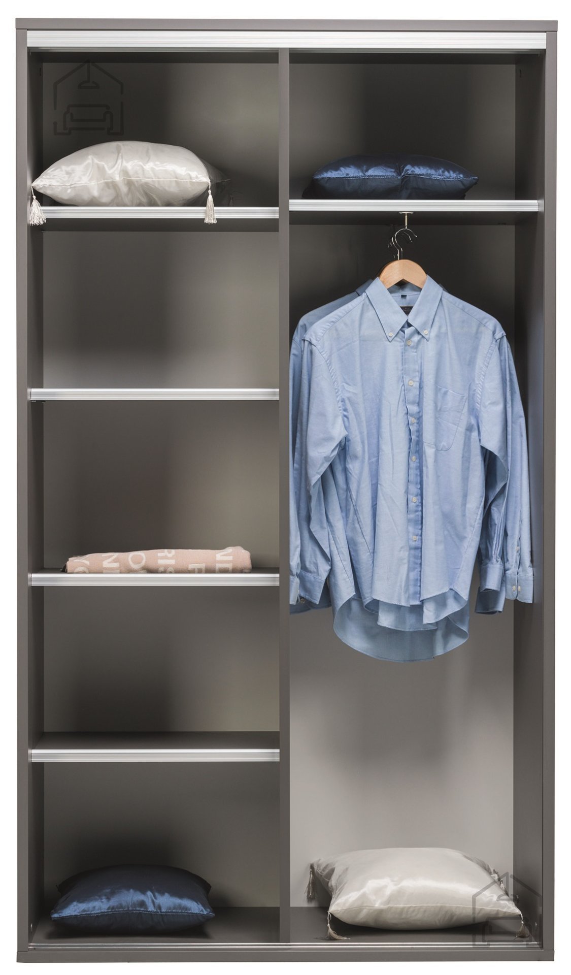 Der Schrank kommt in einer eleganten Kombination aus Grau und Weiß, was eine einfache Integration in jeden Innenraum ermöglicht. Die Farbkombination verleiht einen Hauch von Raffinesse und passt sich leicht verschiedenen Möbelstilen an, von modern bis klassisch. Aluminiumgriffe betonen zusätzlich das moderne Erscheinungsbild und ermöglichen ein einfaches Öffnen der Schiebetüren.