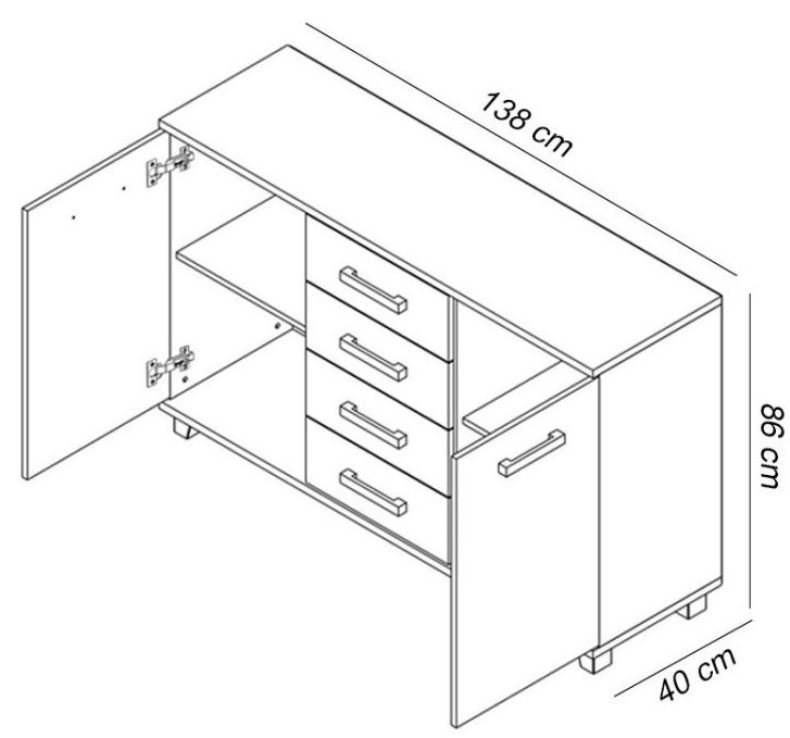 Der Korpus der Kommode besteht aus einer 22 mm laminierten Platte, was Robustheit und Langlebigkeit gewährleistet. Die Fronten sind aus einer 16 mm laminierten Platte gefertigt, was eine elegante und glatte Oberfläche ermöglicht, die leicht zu reinigen ist. Um zusätzlichen Schutz zu gewährleisten, sind die Kanten mit einem 1,7 mm ABS-Kantenband versehen, das vor Beschädigungen und täglicher Abnutzung schützt. Stabilität und ein modernes Aussehen verleihen der Kommode stabile Füße aus metallisiertem Kunststoff.