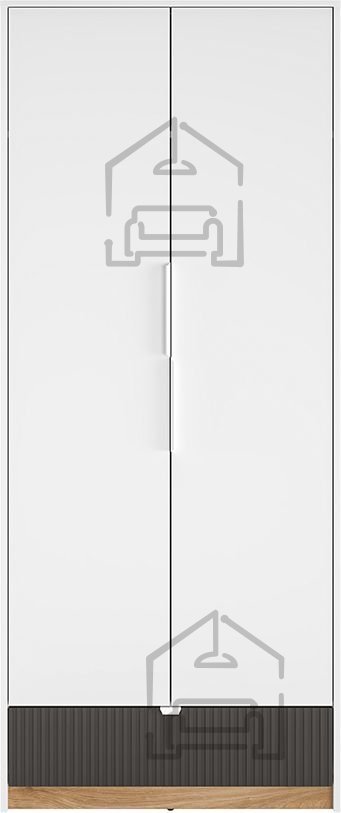 Die Front des Schranks ist in einer eleganten Kombination aus Weiß und MDF Graphit Matt gestaltet, was ein modernes und raffiniertes Aussehen schafft. Der Korpus ist in der Farbe Weiß/Eiche Castello gehalten, was einen Hauch von Wärme und Natürlichkeit verleiht. Dieses Farbschema ermöglicht es, dass der Schrank leicht mit verschiedenen Einrichtungsstilen harmoniert, von modern bis klassisch.