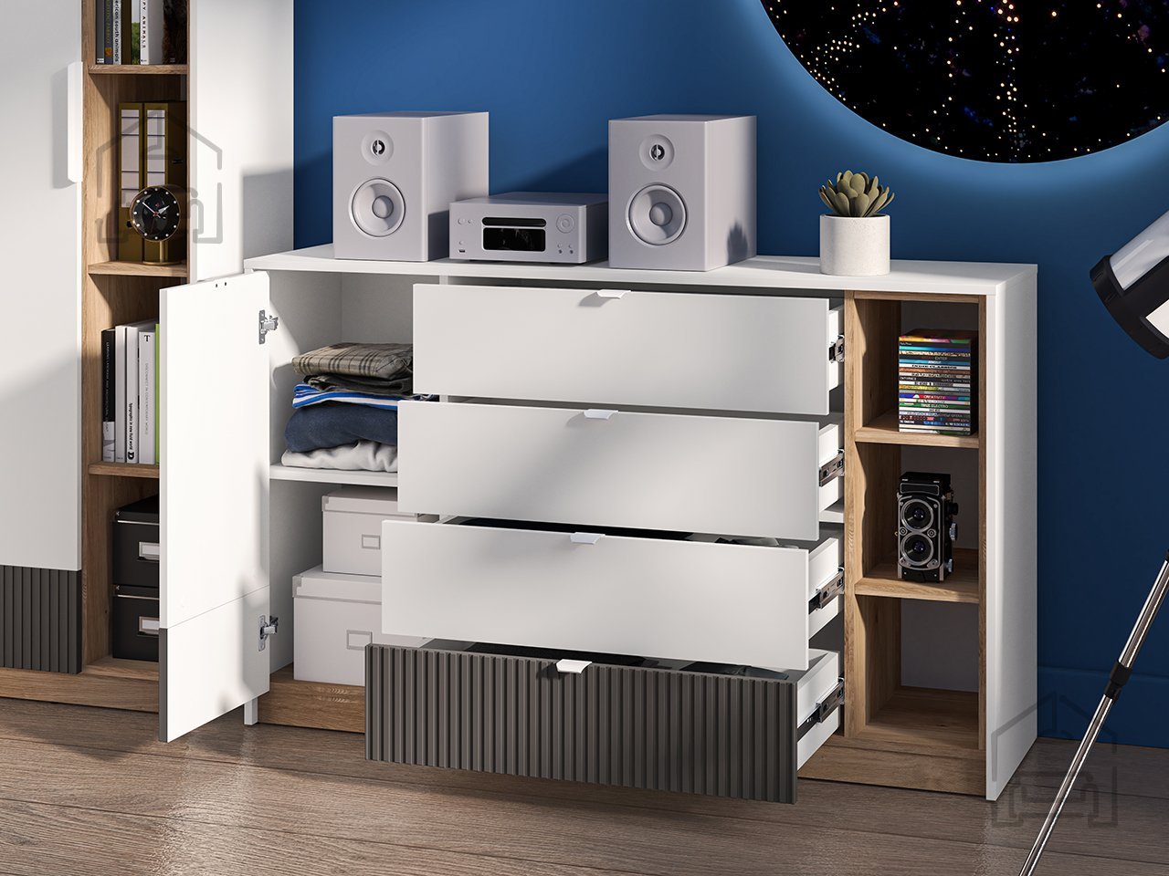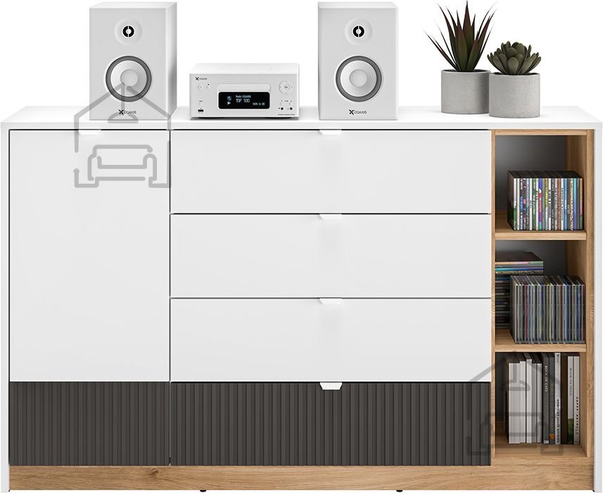 Mit einer Frontfarbe in Weiß und einer MDF-Grafit-Matt-Oberfläche sowie einem Korpus in einer Kombination aus Weiß und Castello-Eiche bringt die Kommode Torino 06 Frische und Eleganz in jeden Raum. Diese Farbkombination ist sorgfältig ausgewählt, um zu verschiedenen Einrichtungsstilen zu passen, von klassisch bis modern.