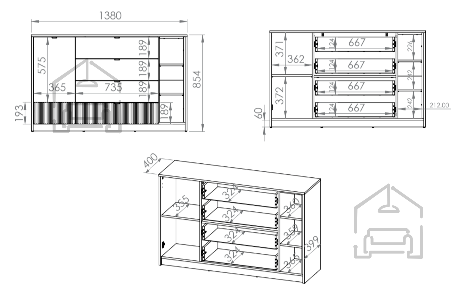 Die Abmessungen des Produkts betragen 138x40x86 cm, was bedeutet, dass sie ausreichend Stauraum bietet und gleichzeitig kompakt genug ist, um nicht zu viel Platz einzunehmen. Die Kommode besteht aus hochwertigem MDF-Material und laminierten Spanplatten, was Haltbarkeit und eine lange Lebensdauer gewährleistet.