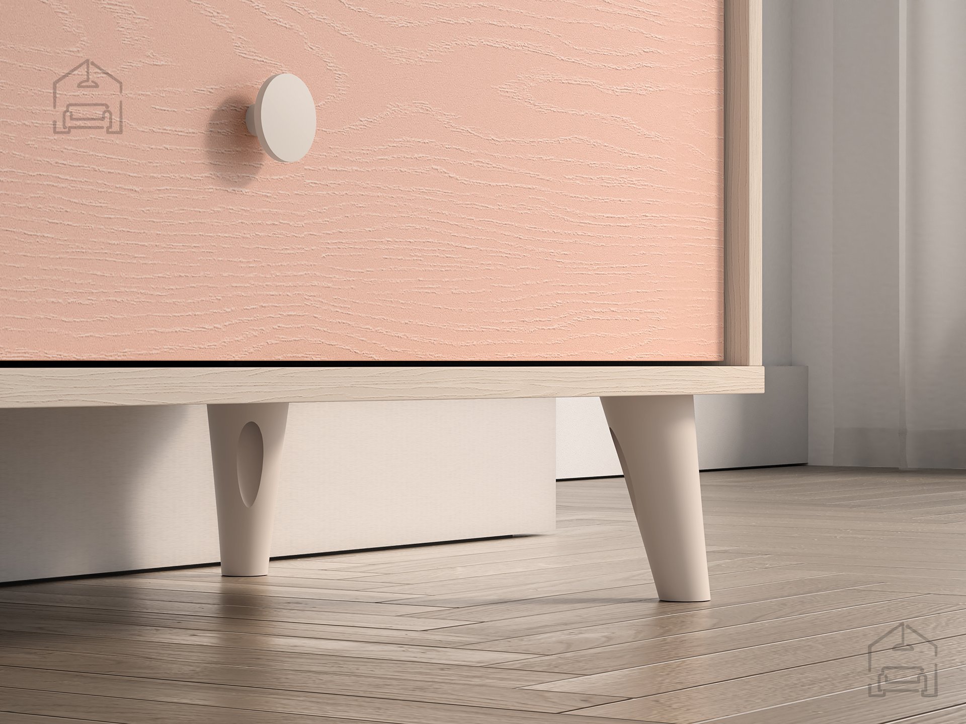 Einer der größten Vorteile der Kommode Mevel 06 ist ihr attraktives Farbschema. Die Front in der trendigen Farbe Millennial Pink bringt Frische und Modernität, während der Korpus in der Farbe Desert Sand einen warmen und neutralen Kontrast bietet. Diese Farbkombination ermöglicht es, dass sich die Kommode problemlos in verschiedene Einrichtungsstile einfügt, von modern bis klassisch.