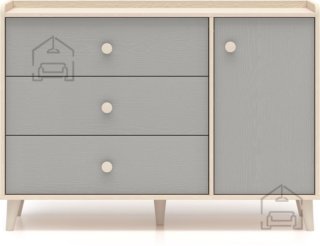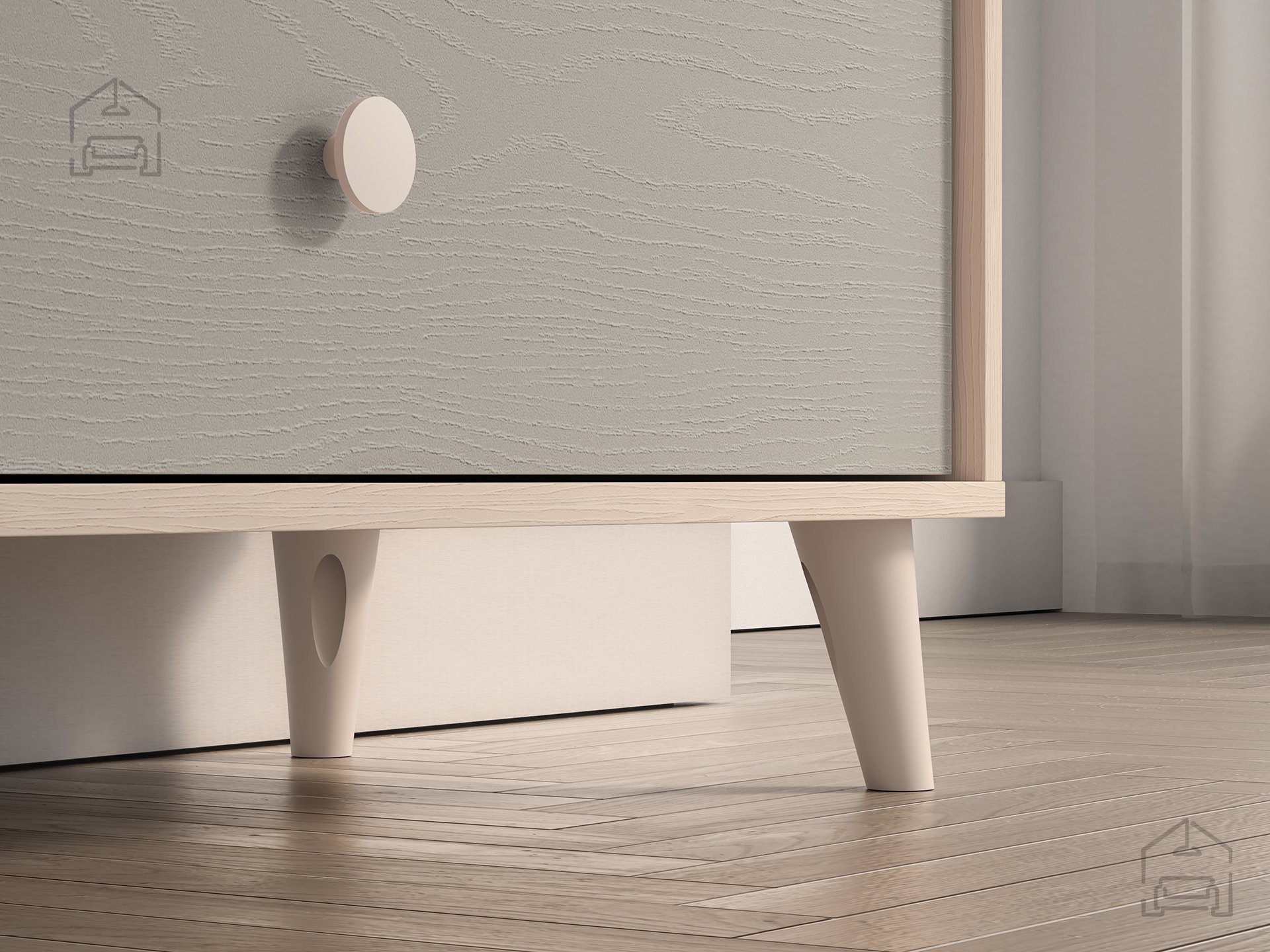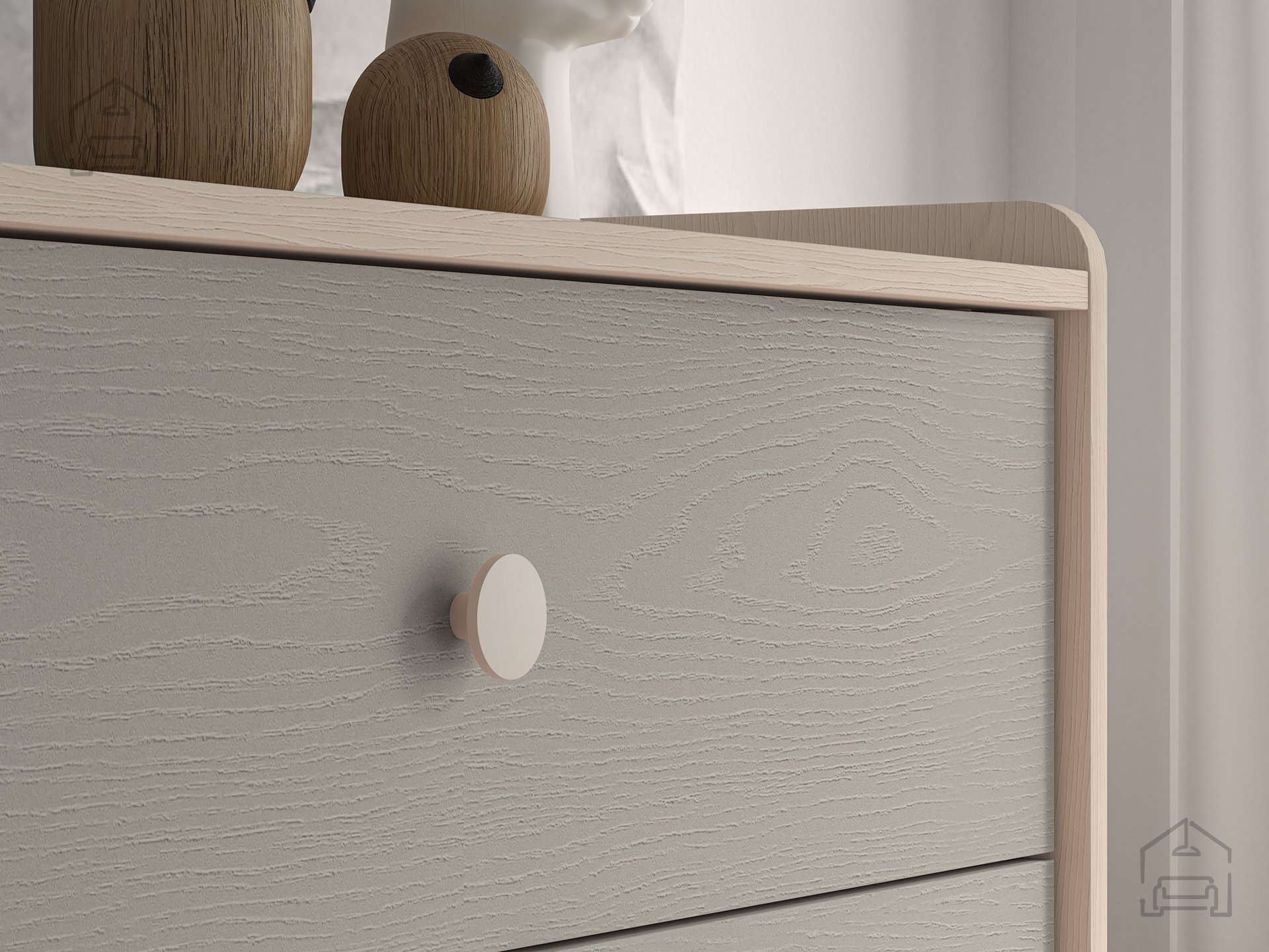 Die Farbe der Front in Grauton und des Korpus in Desert Sand schafft eine harmonische Kombination, die sich leicht an verschiedene Einrichtungsstile anpasst. Diese subtile Farbpalette vermittelt ein Gefühl von Wärme und Komfort und verleiht zugleich einen Hauch von Modernität und Raffinesse. Die Kommode Mevel 05 ist mehr als nur ein Möbelstück; sie ist Ausdruck Ihres persönlichen Stils.