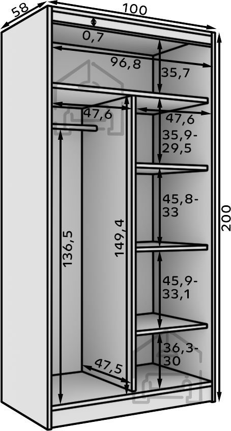 Mit den Maßen 100x58x200 cm bietet der Schrank ausreichend Platz, um Ihre Kleidung übersichtlich zu verstauen. Gleichzeitig sparen die Schiebetüren wertvollen Raum, was ihn besonders für kleinere Wohnungen oder schmale Flure praktisch macht. Die Türen lassen sich leicht öffnen, ohne zusätzlichen Platz vor dem Schrank zu benötigen – eine durchdachte Lösung für den Alltag.