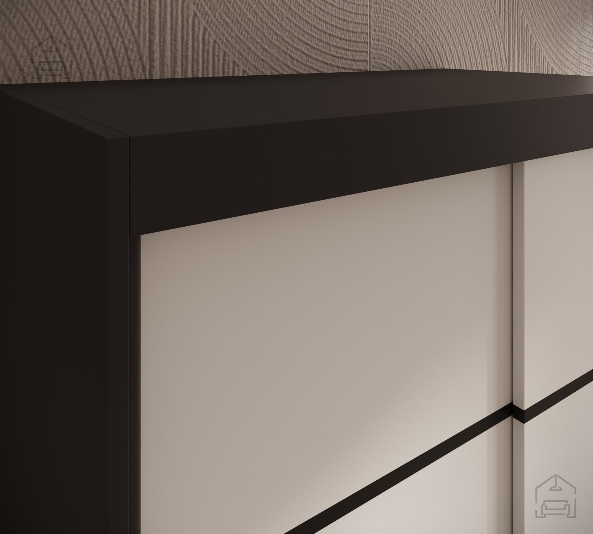 Die perfekte Lösung für alle, die sich ein aufgeräumtes und stilvolles Zuhause wünschen: ein sorgfältig gestalteter Kleiderschrank mit Schiebetüren, der Funktionalität und modernes Design harmonisch vereint. In Räumen, in denen jeder Zentimeter zählt, ist die kompakte Breite von 100 cm die ideale Wahl – ob für kleinere Schlafzimmer, Vorzimmer oder Garçonnièren. Mit einer Höhe von 200 cm bietet er dennoch reichlich Platz für Kleidung, Schuhe und Accessoires. Die Kombination aus Schwarz und Weiß sorgt für einen zeitlosen Kontrast, der sowohl zu minimalistischen als auch klassischen Möbeln passt und sich dadurch mühelos in jedes Wohnkonzept einfügt.